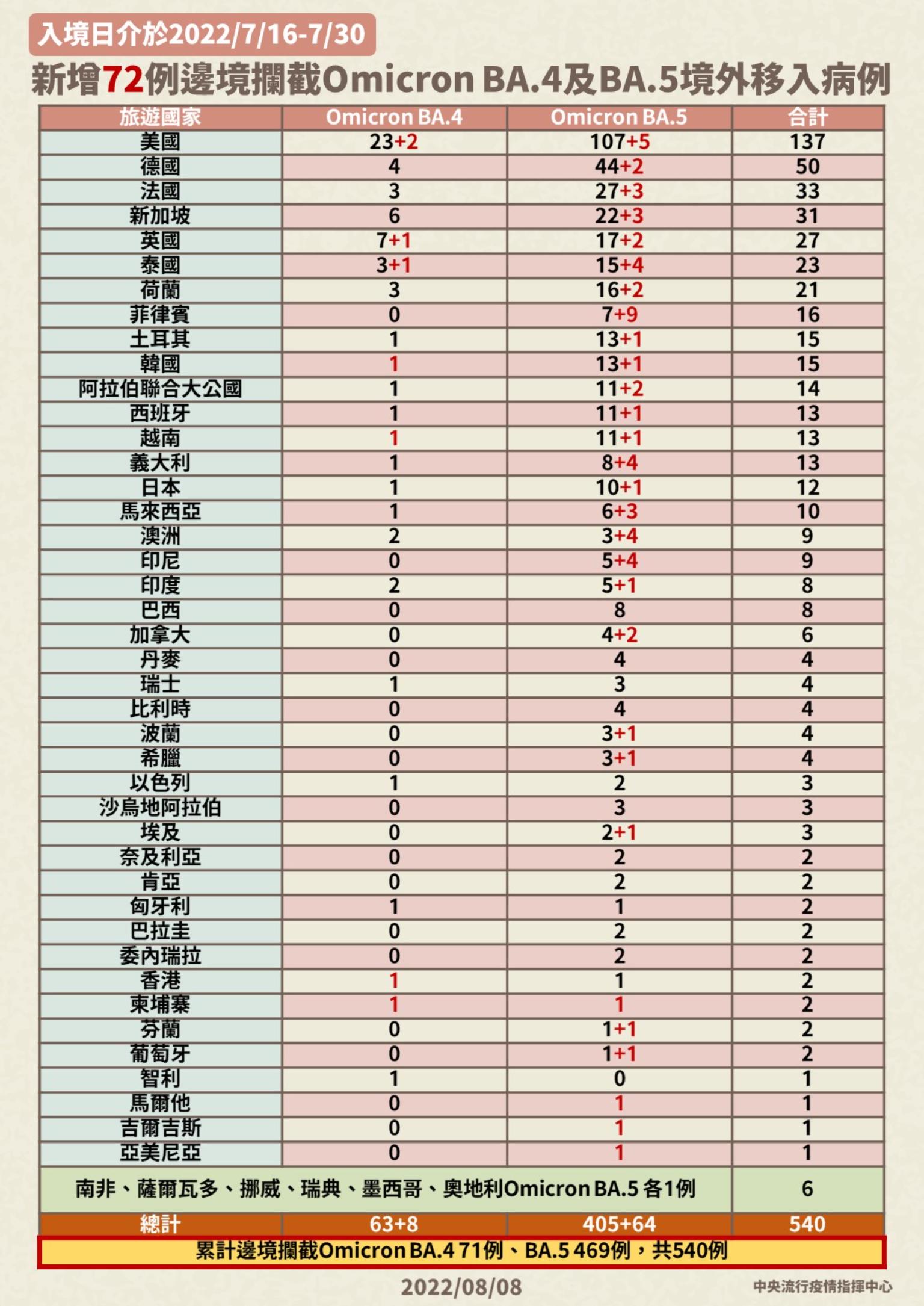 指揮中心表示,國內境外移入個案中新增檢出8株Omicron BA.4及64株Omicron BA.5,個案分別為45例男性、27例女性,年齡介於未滿5歲至70多歲,入境日介於今年7月16日至7月30日。其中檢出Omicron BA.4個案為美國(2例)、柬埔寨、英國、香港、泰國、越南、韓國(各1例);檢出Omicron BA.5個案分別自菲律賓(9例)、美國(5例)、印尼、泰國、義大利及澳大利亞(各4例)、法國、馬來西亞及新加坡(各3例)、加拿大、阿拉伯聯合大公國、英國、荷蘭及德國(各2例)、土耳其、日本、印度、吉爾吉斯、西班牙、希臘、亞美尼亞、波蘭、芬蘭、柬埔寨、埃及、馬爾他、越南、葡萄牙及韓國(各1例) 移入。