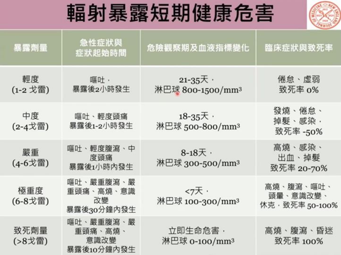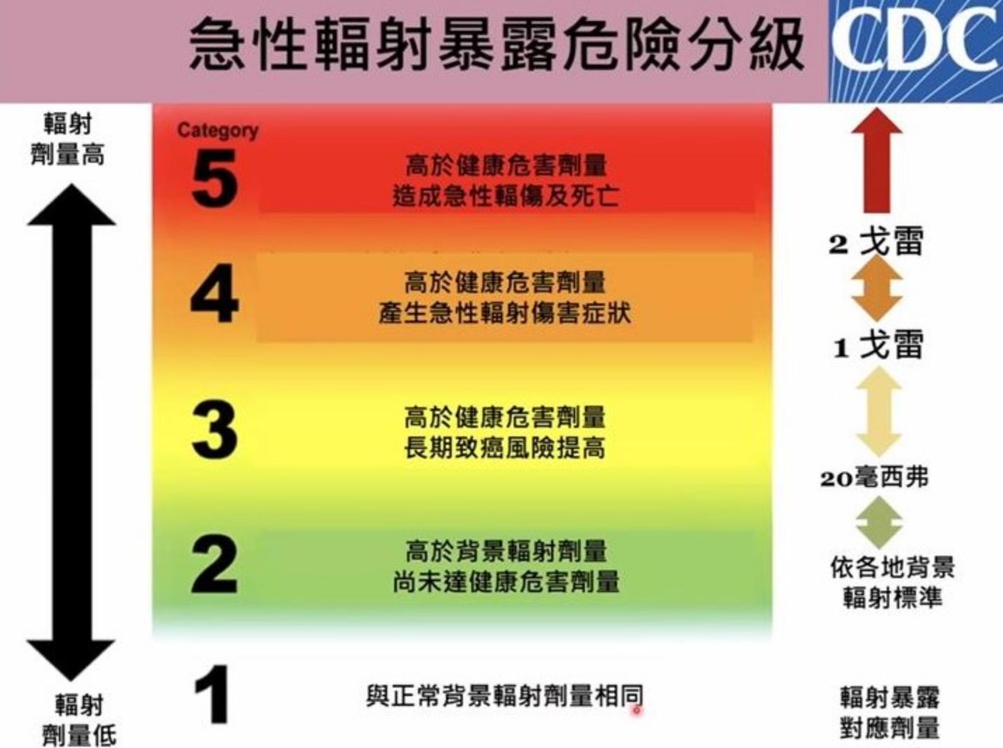 台大公共衛生學院校友、醫師許辰陽解釋,「輻射暴露劑量對於核災害之嚴重度評估具有重要角色,因此美國CDC依據短期(數天內到數周)輻射暴露劑量將核災害分為5個等級,由最低的正常背景輻射暴露到第4及1-2戈雷具有急性輻射傷害症狀,與第5級超過2戈雷高劑量輻射暴露而具有急性傷害與死亡風險。」