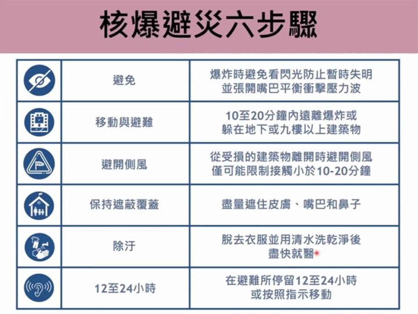 許辰陽強調,「輻射災害的防護以縮短普露時間、遠離暴露源,以及屏蔽暴露源完主要防護原則。」他表示,基於此原則國際原子能委員會也對輻射災害防治發佈對應的避災步驟,在預防發生核子衝突外降低輻射災害的傷害。