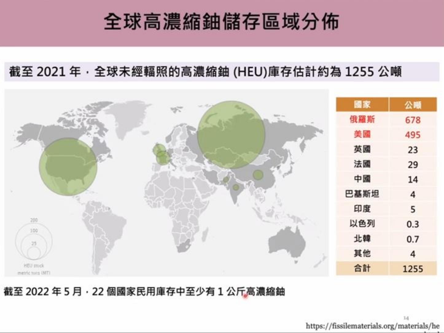 由於核電與核武所需的高濃縮鈾,一直被視為核威脅指標,「全球高濃縮鈾自車諾比核電事故後存量逐年下降,然而目前仍以美俄兩國存量佔大宗。」陳秀熙表示,由過去廣島原子彈轟炸與數起大規模核災引起的傷亡,以及核爆所造成的核冬天,不得不提醒全球俄烏戰爭可能帶來的核威脅隱憂。