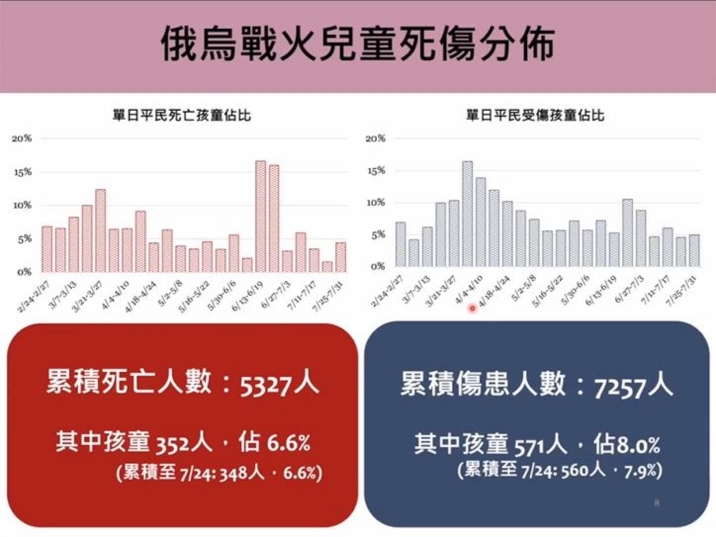 目前累積死亡與受傷人數分別達5,327及7,257人,每日平均34例死亡,兒童死亡與受傷在烏克蘭平民死傷人數中分別維持6.6%及8.0%。根據英國情報指出,俄國將武器置放於紮波羅熱核電廠內及周邊,恐使核災害威脅。