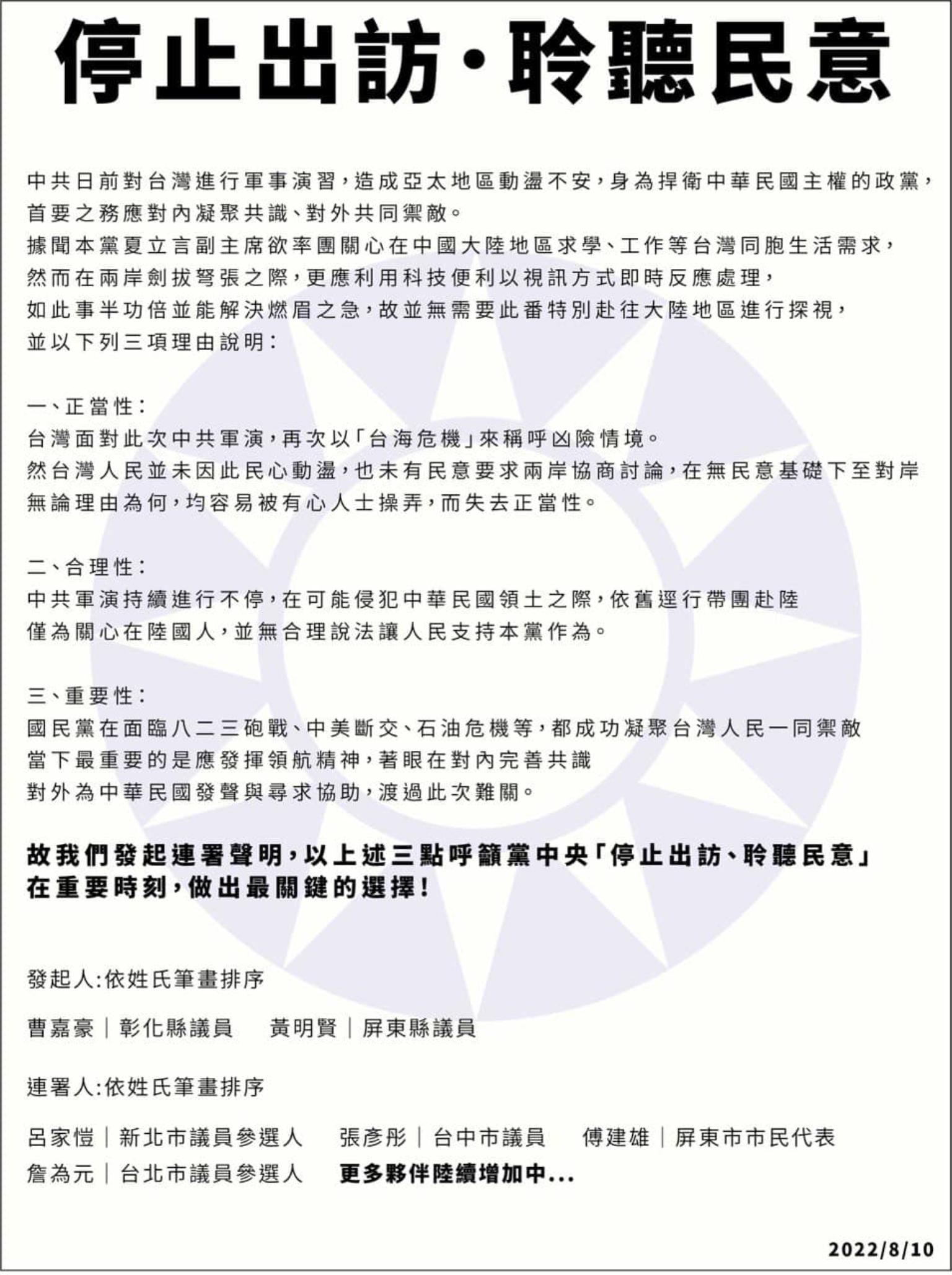 屏東縣議員黃明賢、彰化縣議員曹嘉豪、台中市議員張彥彤、屏東市民代表傅建雄、台北市議員參選人詹為元、新北市議員參選人呂家愷等國民黨青壯派人士今(10)日公開連署反對夏立言率團訪中。