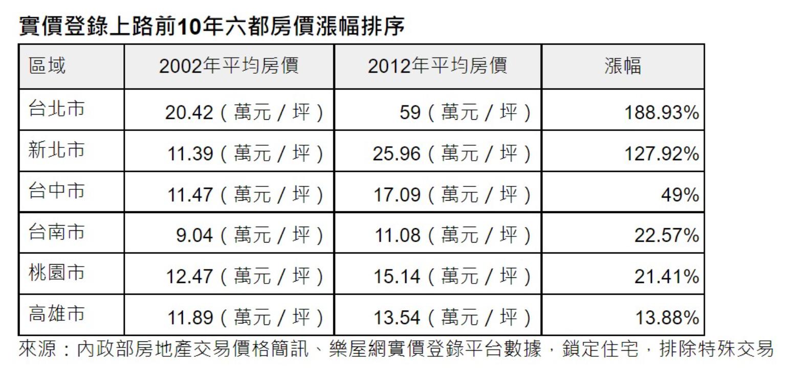 內政部實價登錄制度自2012年8月1日上路,至今剛好屆滿10年,《樂屋網》統計內政部房地產交易價格簡訊2002年資料,比對2012年實價登錄制度上路當年的房價,發現實價登錄上路前,六都為雙北房價漲幅最高,台北市從每坪20.42算元漲到每坪59萬元,漲幅達188.93%,新北市也從每坪11萬元漲到每坪近26萬元,漲幅達127.92%。
