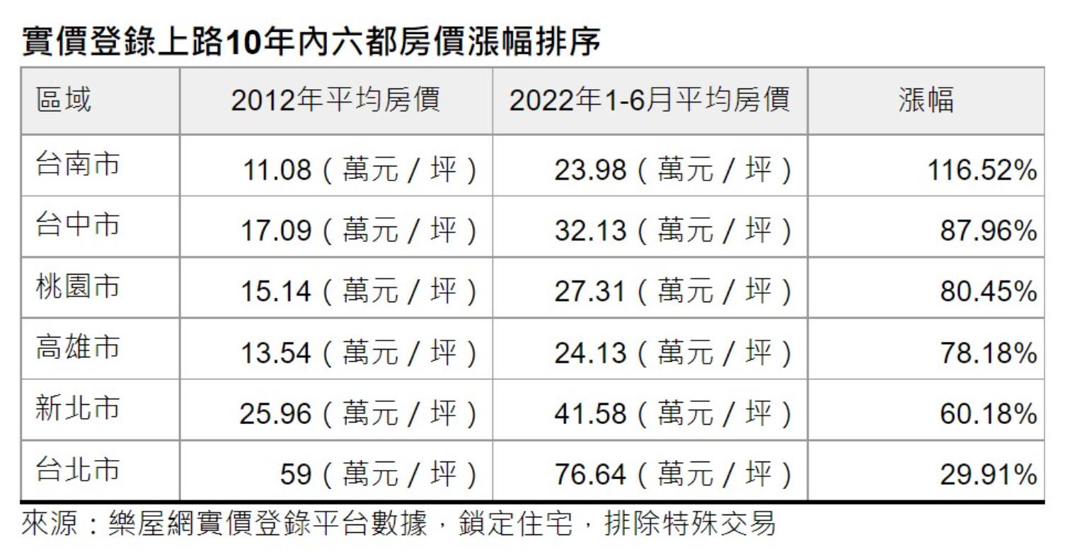 但若以2012年的實價登錄資料,比對今年上半年的實價登錄資料會發現,實價登錄制度上路後10年,房價漲幅最高為台南市,從每坪11萬元漲到每坪近24萬元,漲幅超過百分之百,其次為台中市,漲幅也有8成7,敬陪末座的是台北市,漲幅僅29.9%。