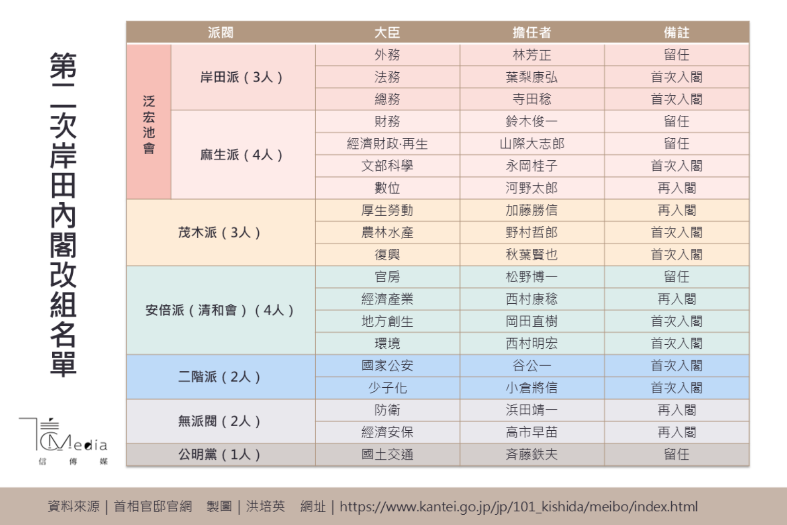 同時,儘管新岸田內閣被認為達到派系平衡,何思慎認為從「泛宏池會」角度來看,再加上與其理念相近的茂木派,反映安倍派(清和會)勢力有所退縮。至於被稱為「女版安倍」的高市早苗,她實為無派系人士,在黨內也是「另類孤鳥」。