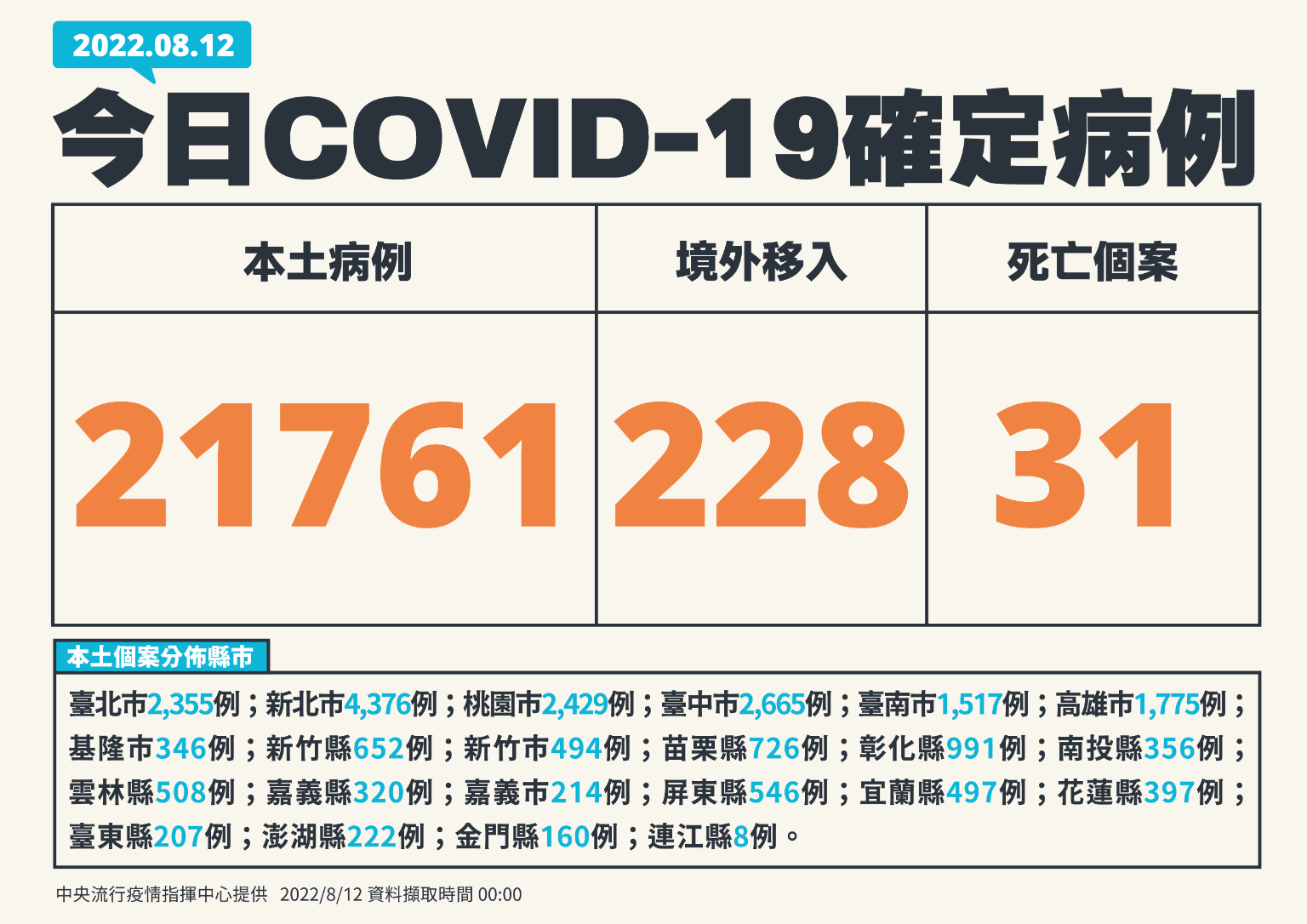 中央流行疫情指揮中心今(12)日公布國內新增21,989例COVID-19確定病例,分別為21,761例本土個案及228例境外移入;另確診個案中新增31例死亡。