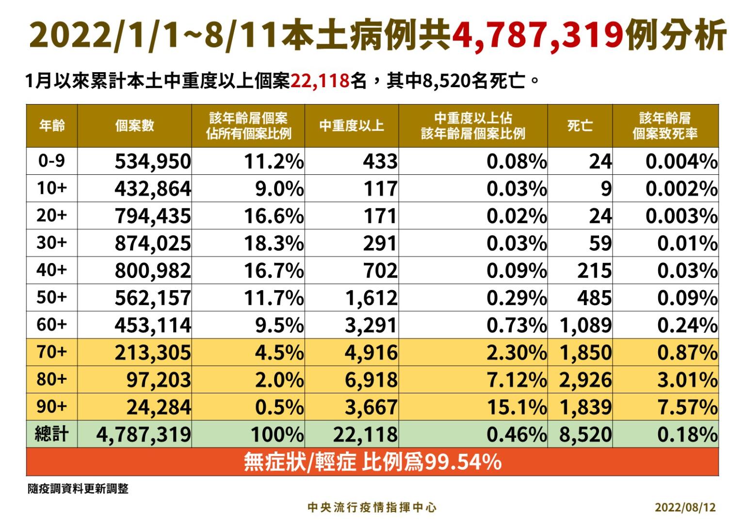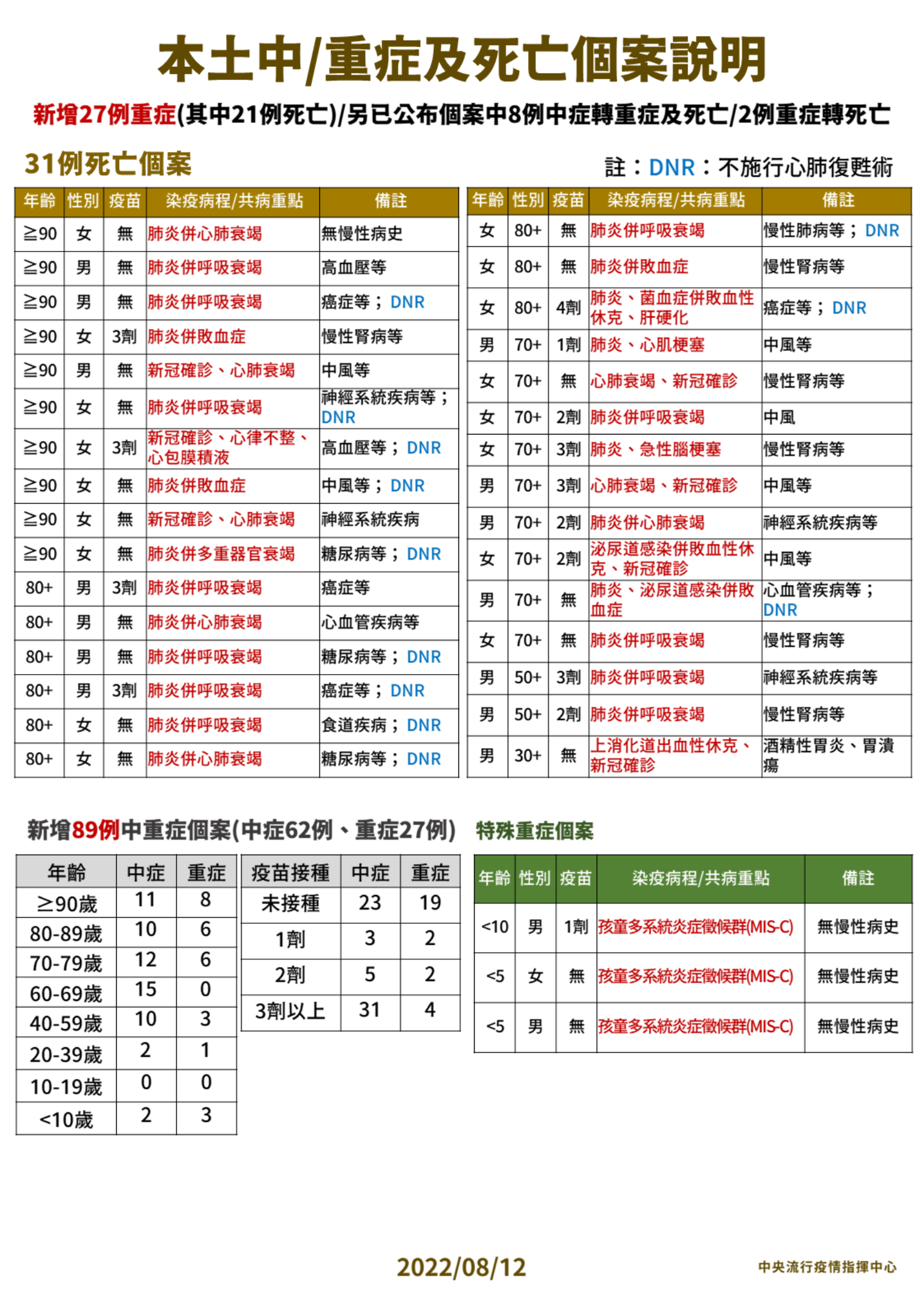 指揮中心指出,今日新增31例本土病例死亡個案,為14例男性、17例女性,年齡介於30多歲至90多歲以上,皆屬重度感染、30例具慢性病史、23例未接種3劑COVID-19疫苗。確診日介於今(2022)年6月28日至8月9日,死亡日期介於6月12日至8月9日,詳如新聞稿附件。