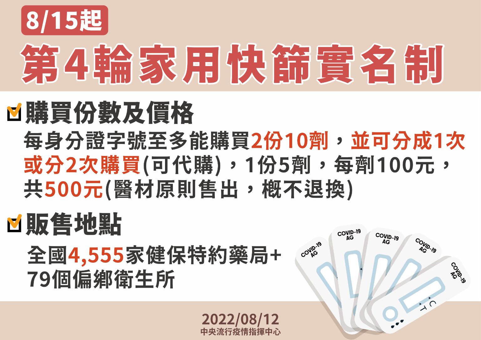 中央流行疫情指揮中心今日表示,鑑於COVID-19國內疫情處於廣泛社區流行,因應民眾購買家用抗原快篩試劑之需求,及保護幼兒健康,故宣布自今(2022)年8月15日起,實施第四輪家用抗原快篩試劑實名制及第三輪0-6歲學齡前幼兒免費領取1份(5劑)快篩試劑。目前實名制家用抗原快篩試劑貨源充足,為滿足民眾購買之需求,從原先購買1份(5劑),增加至多可購買2份(10劑),並可分成1次或2次購買(可代購),售價仍維持每份(5劑)500元,籲請有需求與符合資格的民眾,可持健保卡至販售實名制家用抗原快篩試劑的健保特約藥局與衛生所購買/領取。