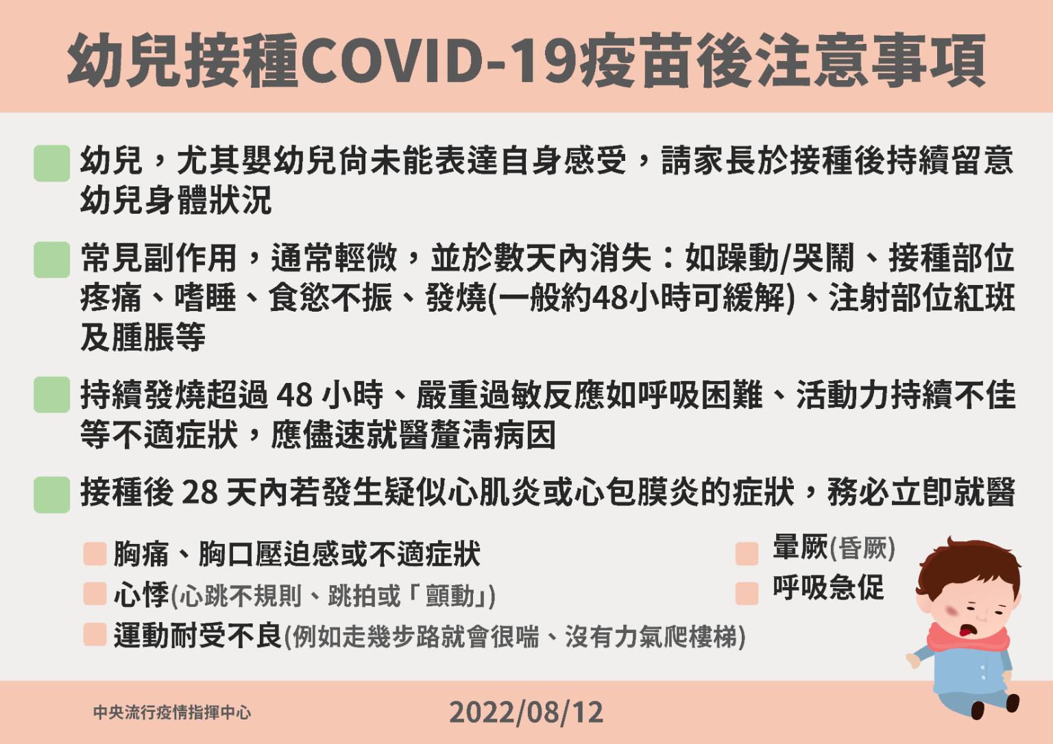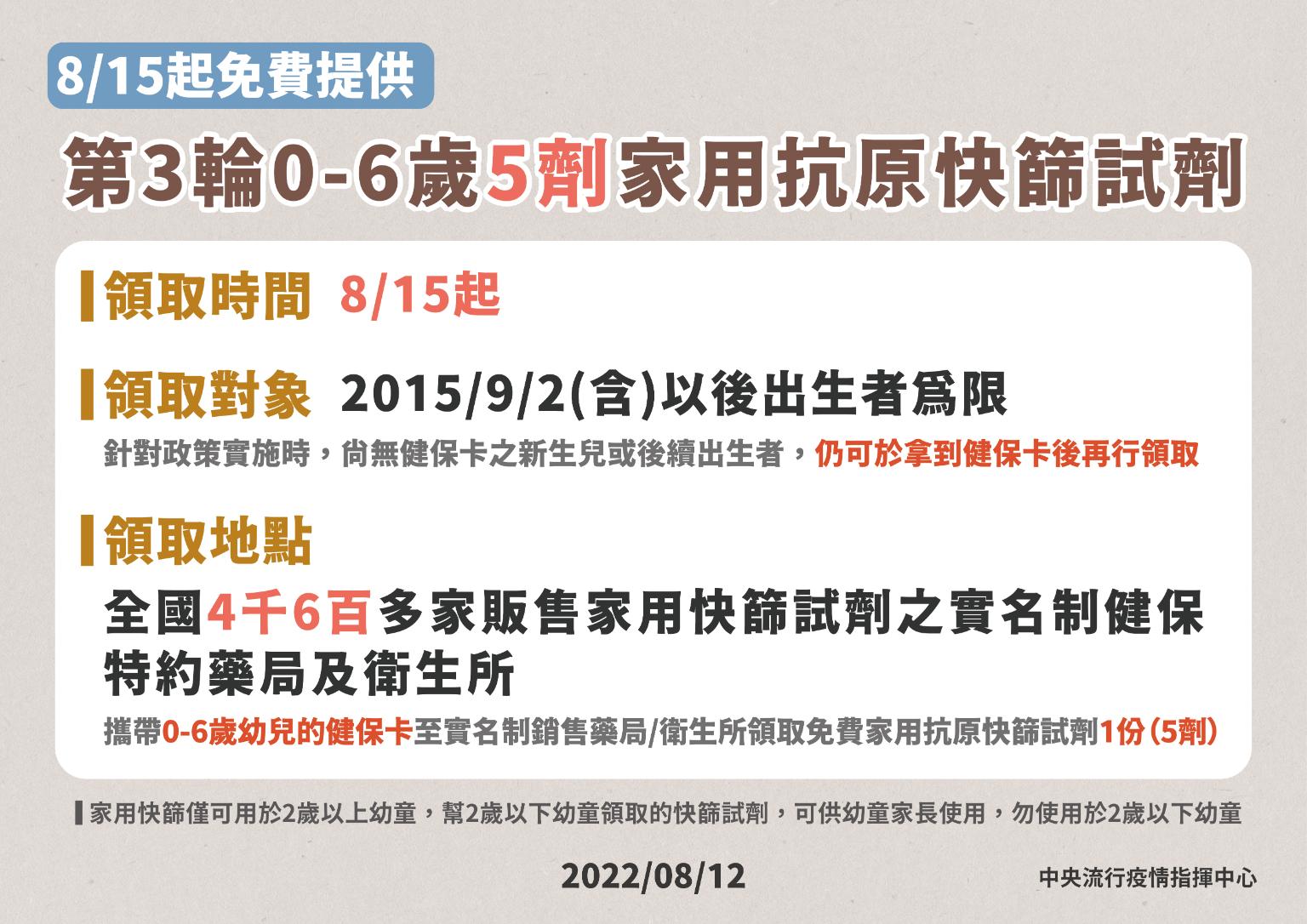 另為提供幼兒家庭更足量的家用抗原快篩試劑,及保障尚未接種COVID-19疫苗之0至6歲幼兒健康,指揮中心表示,自6月1日實施0至6歲幼兒免費領取5劑快篩試劑政策,並於6月6日起,實施對象擴大為2015年9月2日(含)以後出生的學齡前幼兒,民眾可持2015年9月2日(含)以後出生的學齡前孩童健保卡,至各快篩實名制販售據點免費領取一份5劑家用快篩試劑,此免費領取份數,不會計算入家用抗原快篩試劑實名制的購買資格。之後於7月1日實施第二輪讓0至6歲學齡前幼兒再免費領取1份5劑快篩試劑,本次8月15日實施的第三輪,維持每位幼兒免費領取1份5劑。