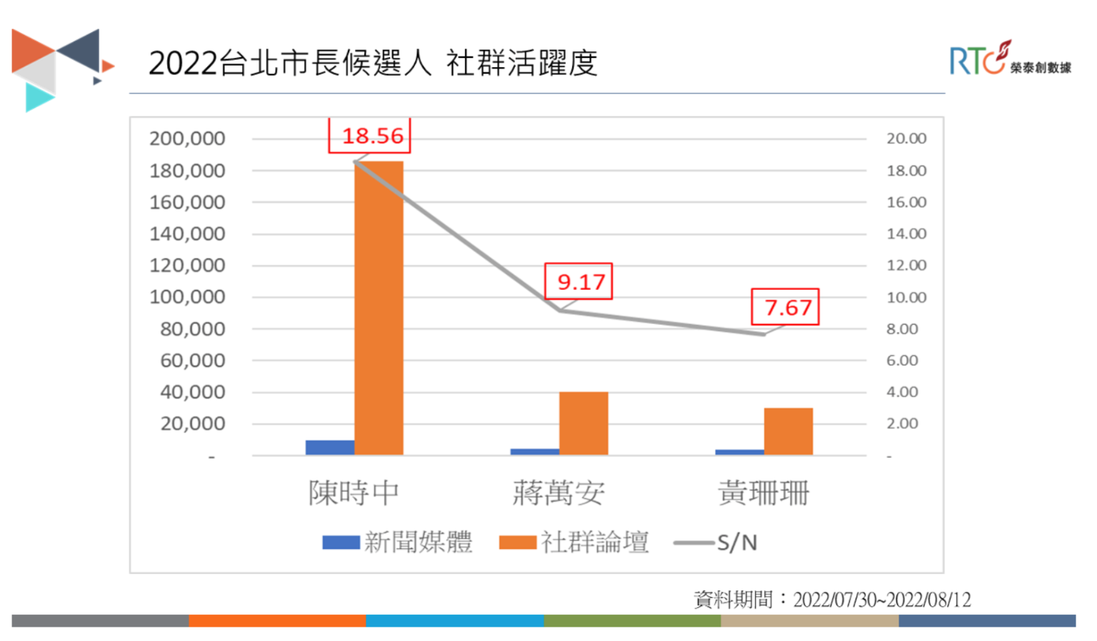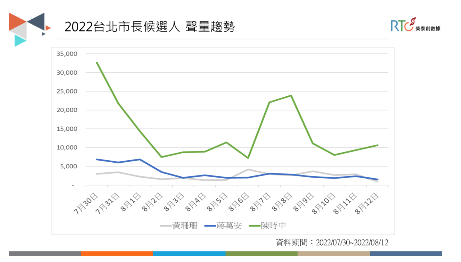 《榮泰創數據》觀察首都台北市長選情,陳時中退去防疫指揮官角色,網路聲量仍高於其他2位參選人,有人認為陳時中是「選舉奇才」,金句不斷吸引關注與討論,7月時,陳時中的網路聲量仍在高點,來到8月,隨著裴洛西訪台、中共軍演等,讓北市選舉的網路聲量雪崩式下滑。