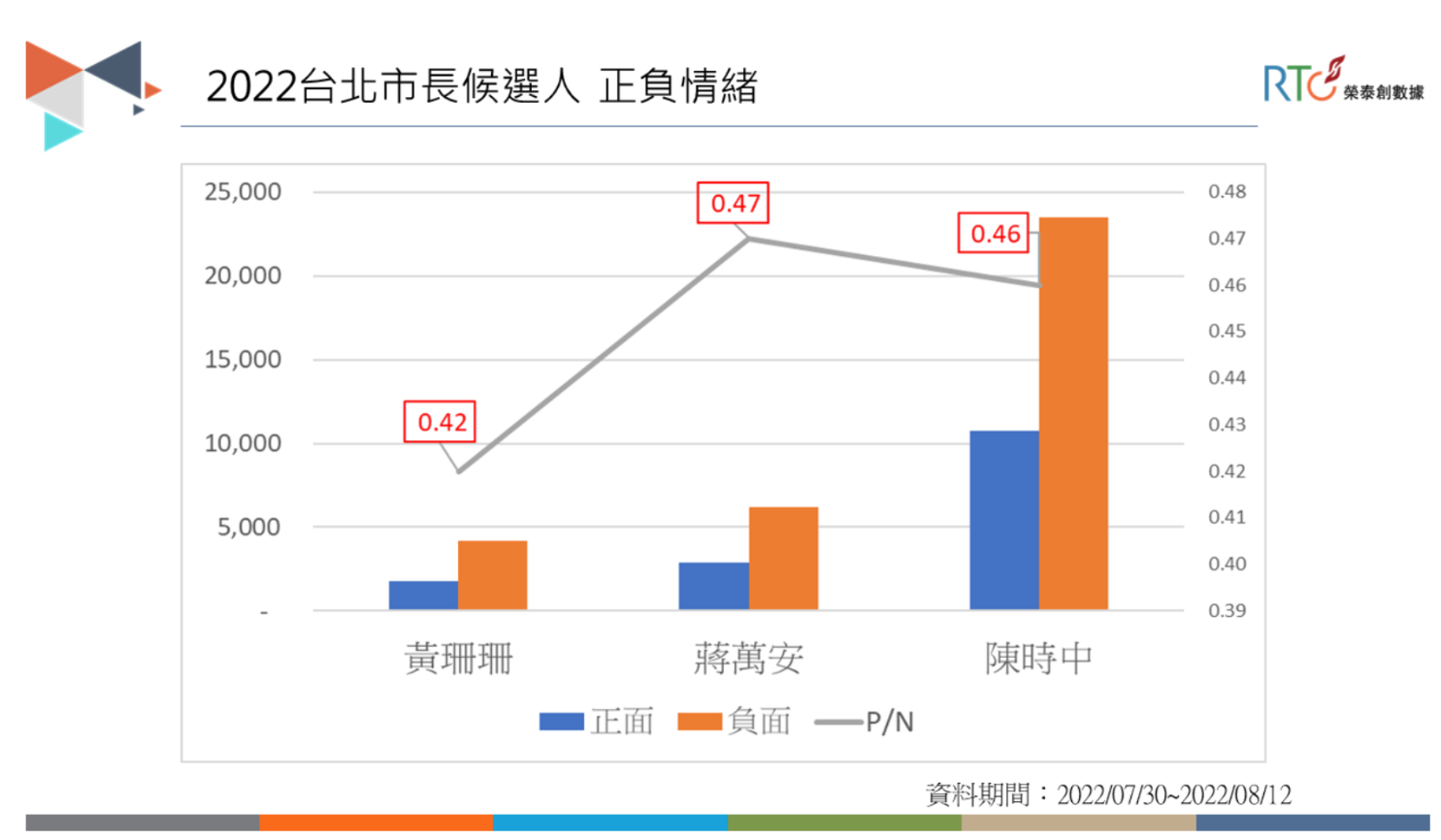 正負聲量方面,網路聲量數據分析,3位參選人的正負值僅些微差距,國民黨蔣萬安0.47與小贏民進黨陳時中0.46,而黃珊珊則相對較低一些0.42,顯示網友目前針對3位台北市長參選人好感度差距不大。