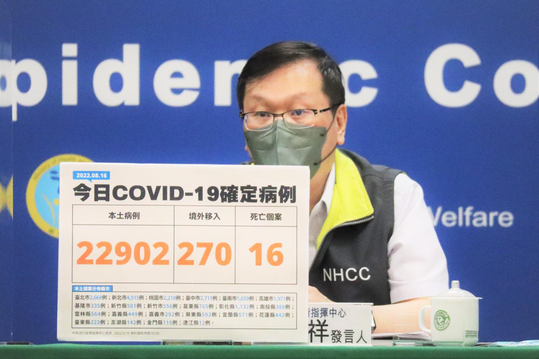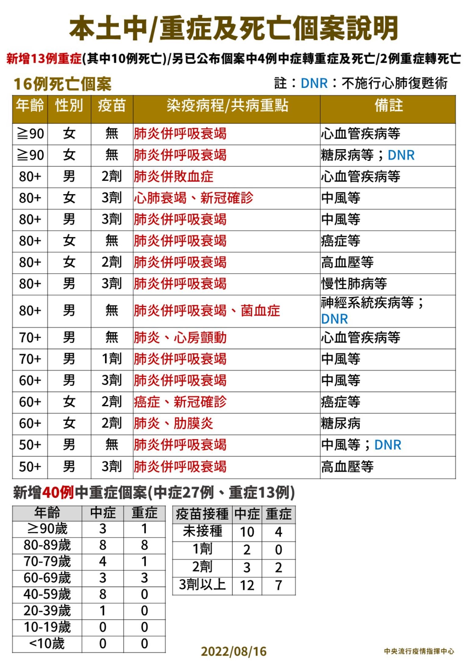 指揮中心指出,今日新增16例本土病例死亡個案,為9例男性、7例女性,年齡介於50多歲至90多歲以上,皆屬重度感染且具慢性病史、11例未接種3劑COVID-19疫苗。確診日介於今(2022)年6月27日至8月13日,死亡日期介於6月10日至8月13日。