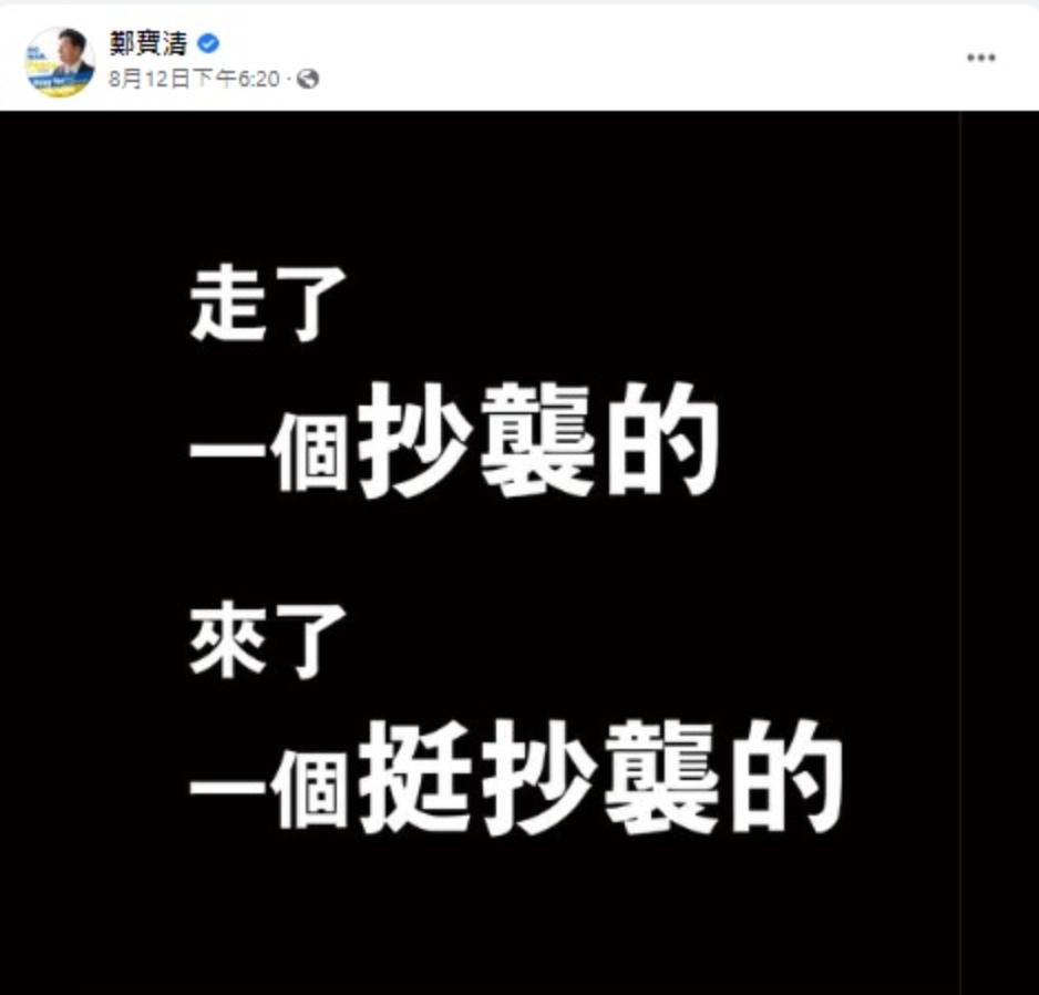鄭寶清先前批評林智堅論文一事,即被地方笑稱是「桃園高嘉瑜」,「換堅」改由鄭運鵬中繼後,鄭寶清更酸度破表地發文稱:「走了一個抄襲的 來了一個挺抄襲的。」