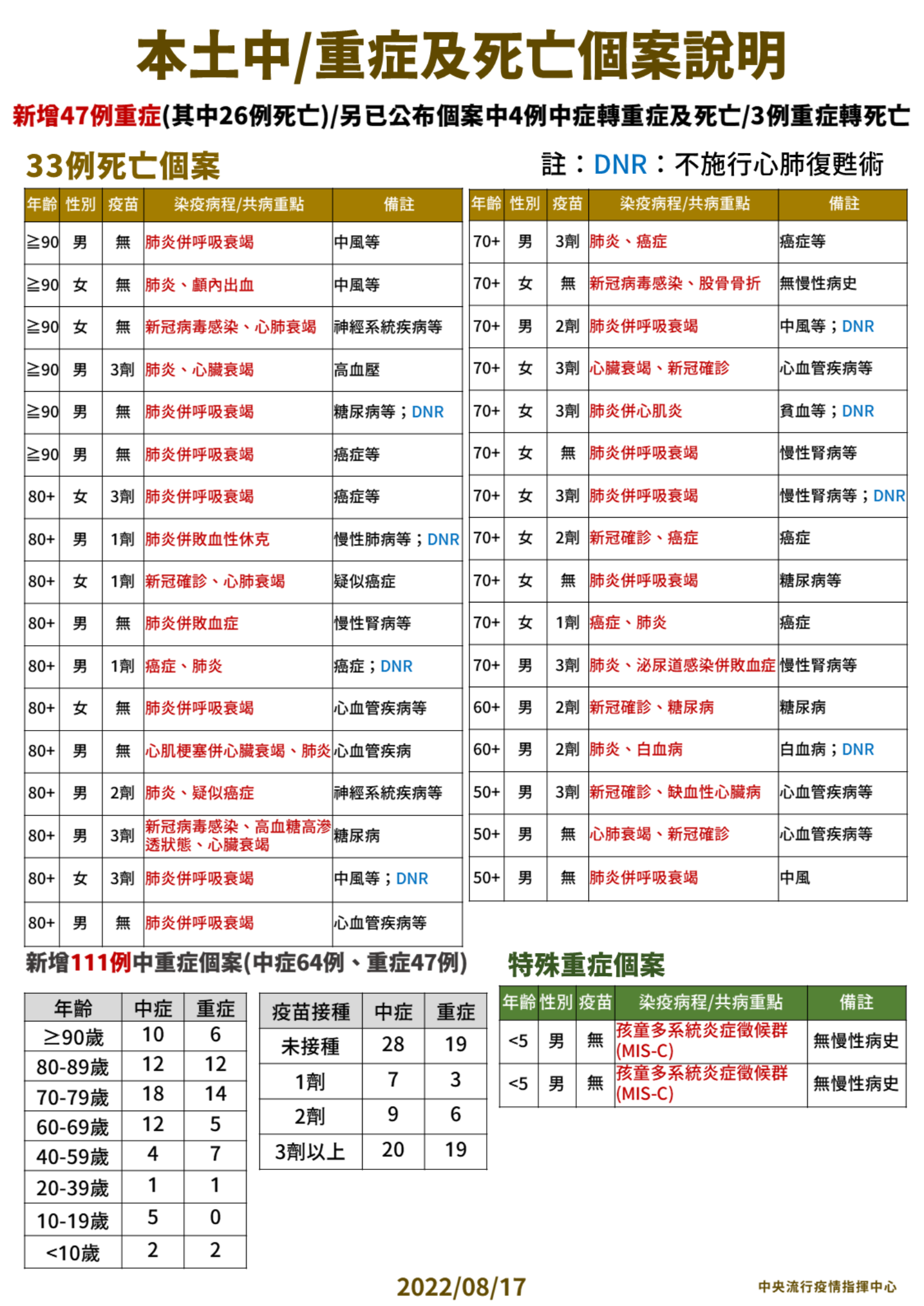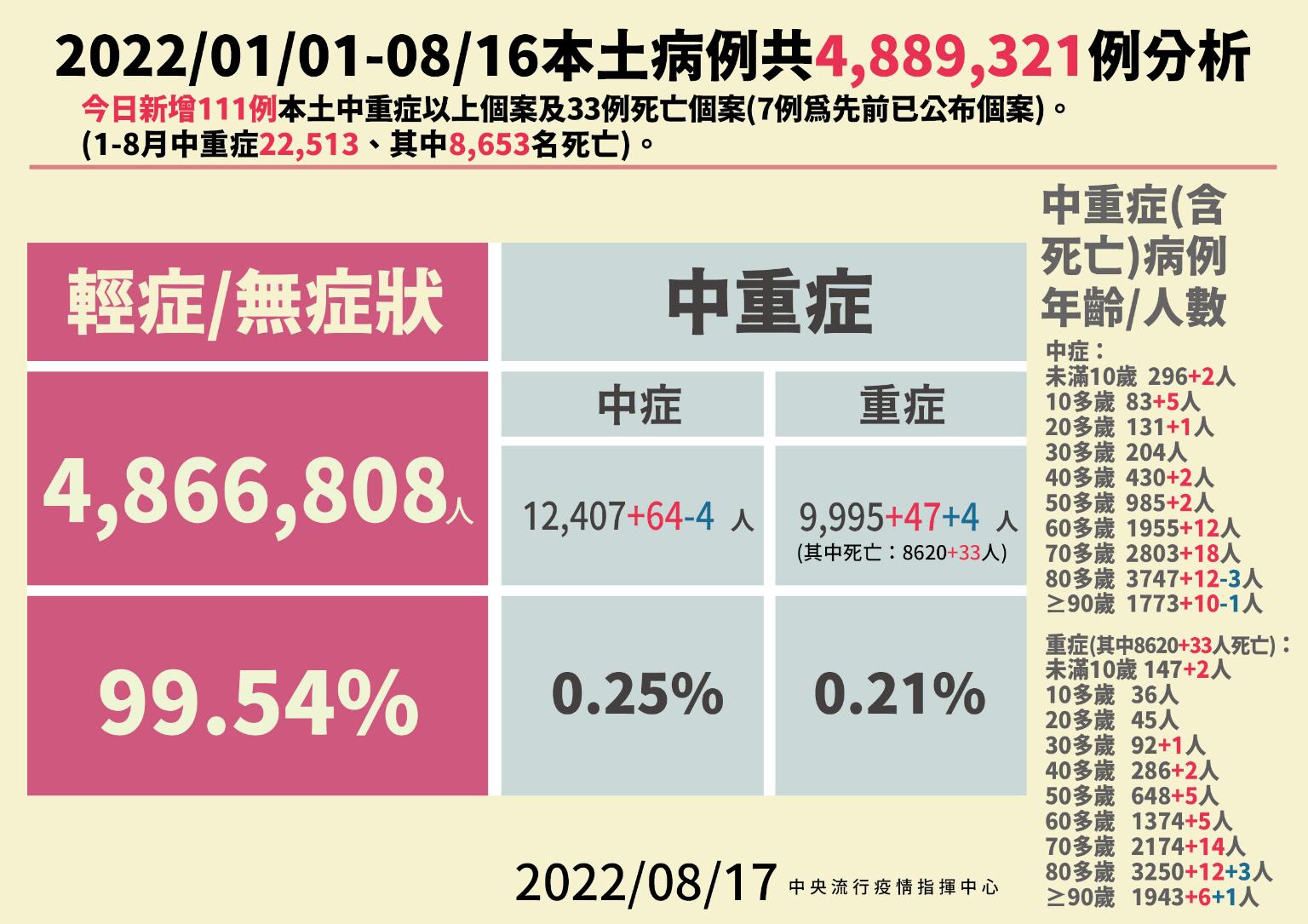 指揮中心指出,今日新增33例本土病例死亡個案,為19例男性、14例女性,年齡介於50多歲至90多歲以上,皆屬重度感染、32例具慢性病史、23例未接種3劑COVID-19疫苗。確診日介於今(2022)年5月11日至8月13日,死亡日期介於5月11日至8月14日,詳如新聞稿附件。