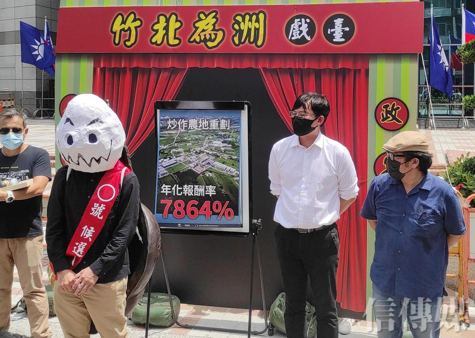 趁著今天國民黨召開中常會,時代力量前立委黃國昌趕赴國民黨踢館,指控國民黨竹北市長參選人林為洲立委海撈1.2億未申報。他指出,新竹縣芎林鎮的「金獅自辦農村社區土地重劃」案,林為洲透過設立「群茂開發公司」,於2019年8月1日以每坪約4.1萬元取得約765坪抵費地,19天後以每坪20萬元售出,海撈1.2億元。