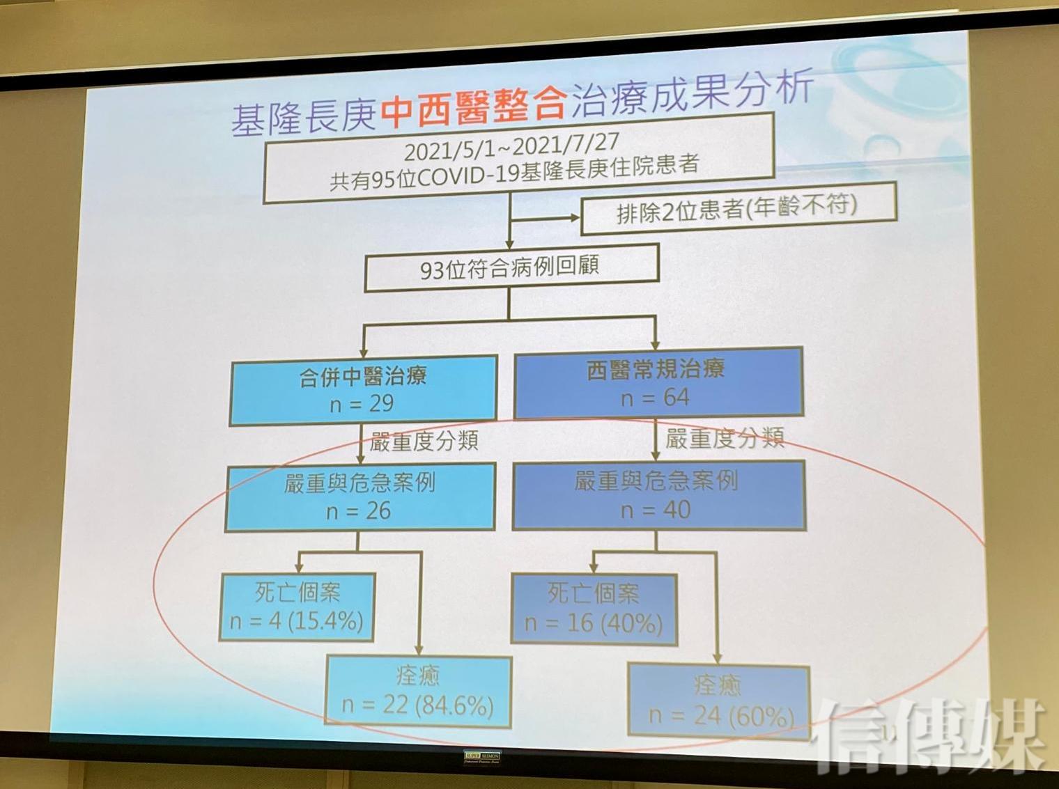 而基隆長庚醫院也運用中西醫整合治療模式並進行研究,研究團隊針對2021年5月至2021年7月共93位COVID-19住院患者進行分組研究,其中29位施以中西醫整合治療,對照64位病人以西醫常規治療。黃澤宏指出,研究結果也顯示,同時接受中西醫整合治療的病人,死亡率為15.4%、痊癒率為84.6%,而對照組則分別為40%和60%,顯示中西醫整合治療模式是相當有潛力的治療方向。