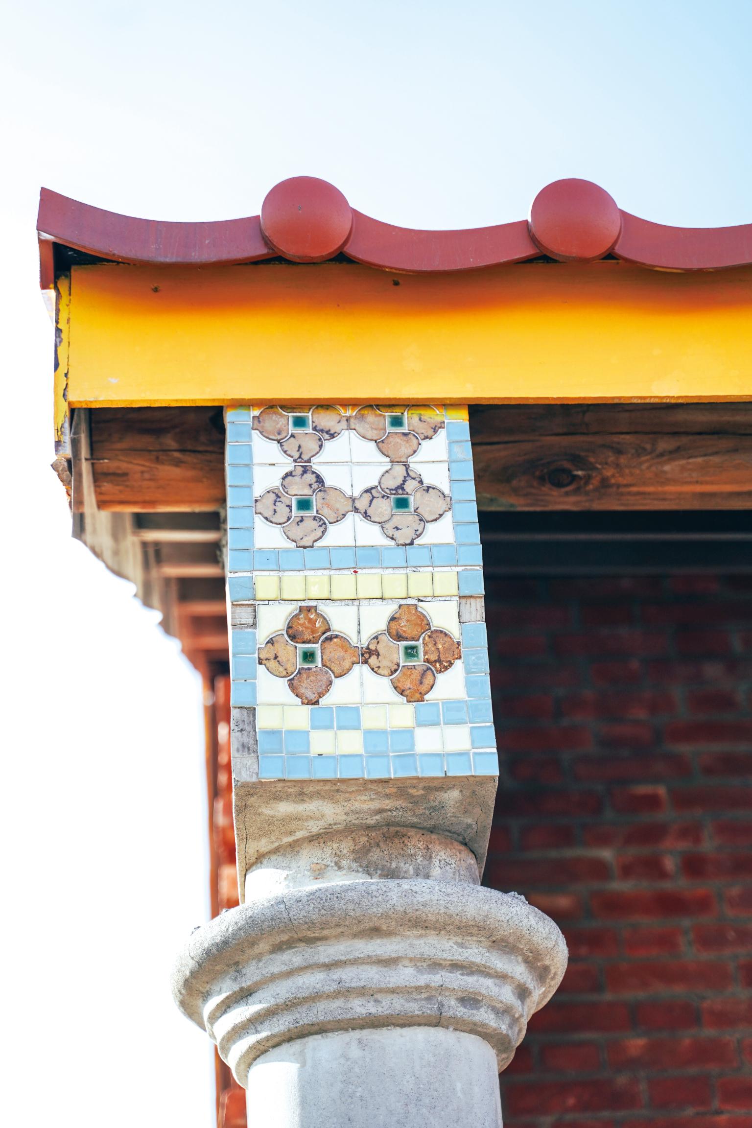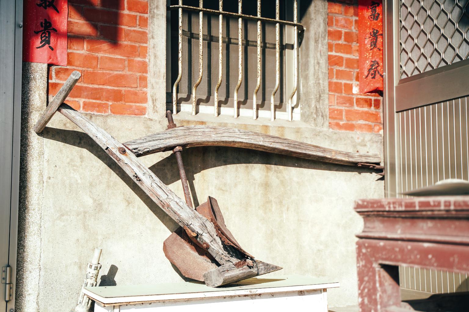 走進蔡家祖厝的前院,抬頭可以看見屋頂上黃紅相間的琉璃瓦在陽光下熠熠閃耀著,蔡崇本、蔡崇場熱心地一一介紹正廳門前陳列著早期農耕時期的古農具:風鼓、犁、菜籃、甕缸等等,如數家珍。他們說,這些都是真實使用過的珍貴寶物,18歲以前就在這裡成長生活的他們,這些農具都是用來幫忙農事,甚至還有他們兒時坐過的育兒籃,讓人彷彿能夠透過這些古早味器具,穿越到那個純真美好的農村大家庭時代,跟著他們的兒時記憶,一起在前院裡一邊曬穀一邊玩耍。