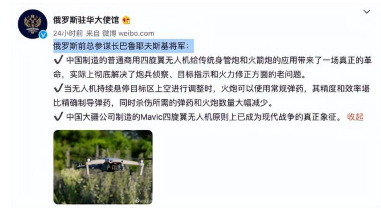 中國雖否認援助俄軍,但俄羅斯仍說溜嘴。俄國駐中國大使館8月12日官方微博貼文稱,俄國前總參謀長巴魯耶夫斯基將軍稱讚,中國大疆公司製造的Mavic4旋翼無人機,已成為現代戰爭的真正象徵。