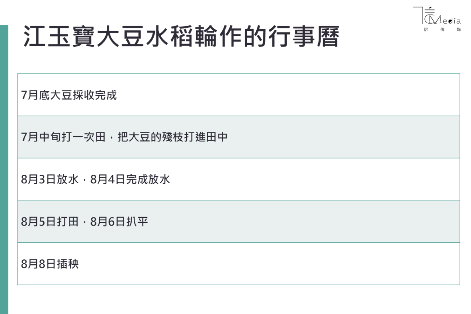 種稻對於土地的地力耗費甚大,所以江玉寶在種水稻前,先種大豆,因為大豆可以固氮,就有了天然氮肥來供應水稻、百合的養分。