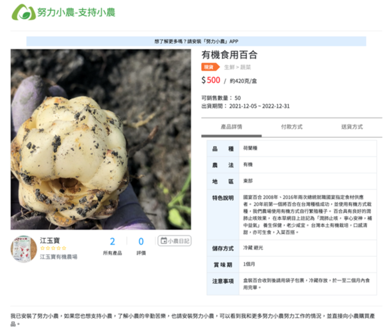 江玉寶已在「努力小農App」上架中,包括有機食用百合,和有機山苦瓜茶包,消費者可以下載「努力小農App」直接向江玉寶訂購。接電話的一定是江玉寶本人。
