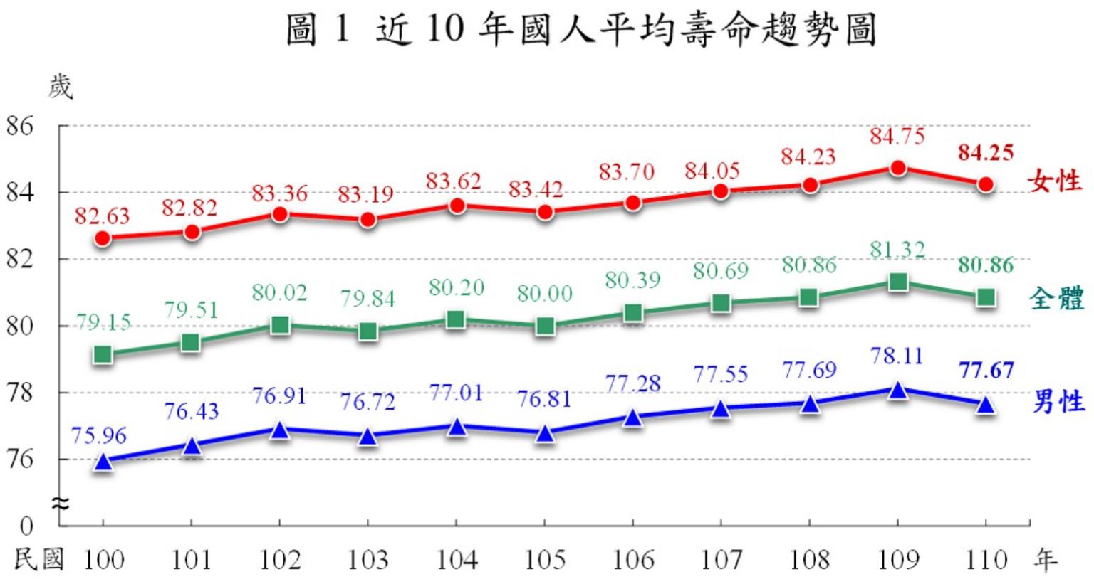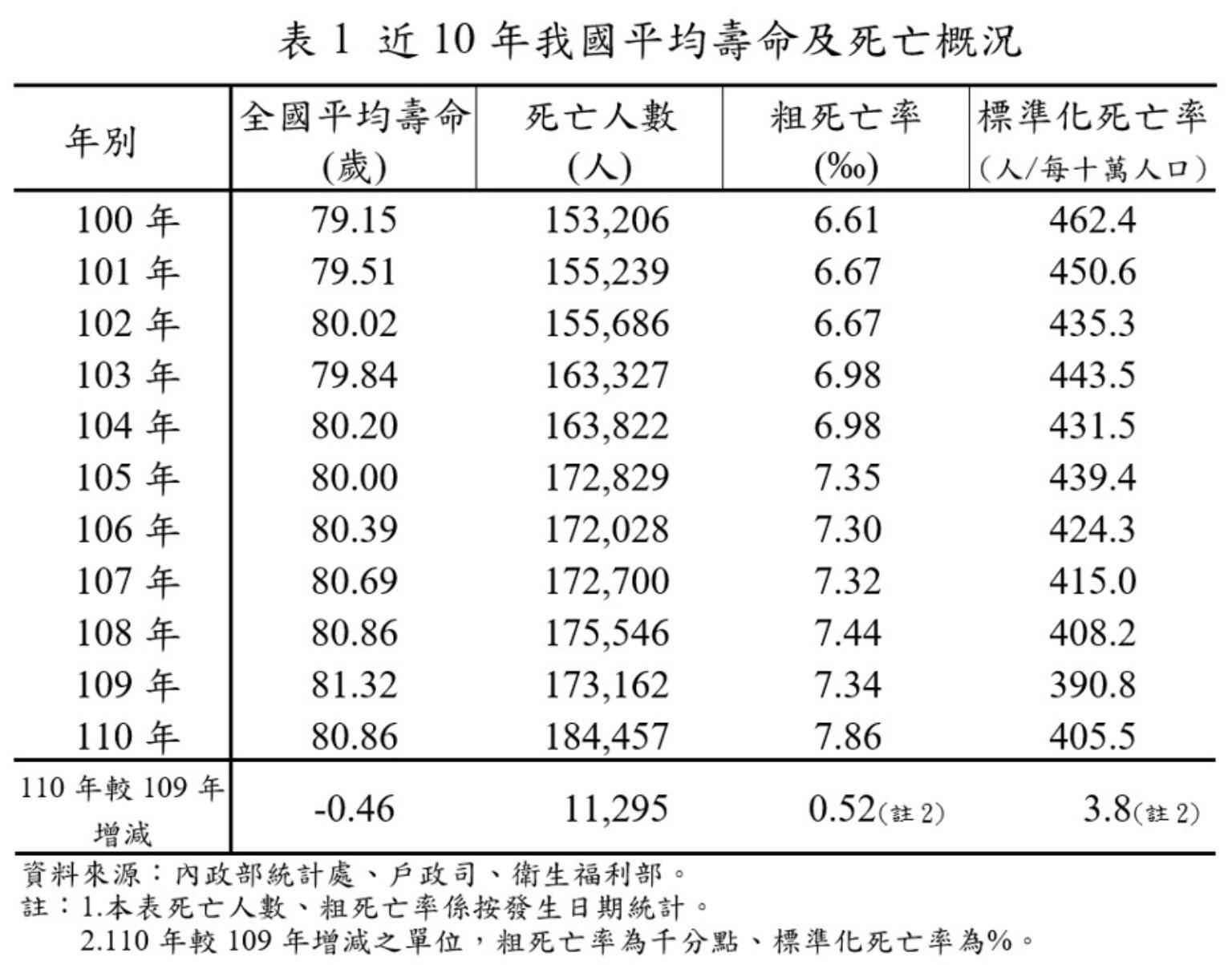 內政部說明,110年標準化死亡率較上年上升3.8%,致國人平均壽命較109年減少0.46歲,其中男性減少0.44歲、女性減少0.50歲。觀察近10年數據,過去亦曾出現單一年度平均餘命下降情形,如103年及105年,當年度標準化死亡率較上年增加時,會造成當年平均壽命下降,皆屬正常統計上發生的短期波動現象,惟長期而言,國人平均壽命呈現上升趨勢,由100年79.15歲增至110年80.86歲。