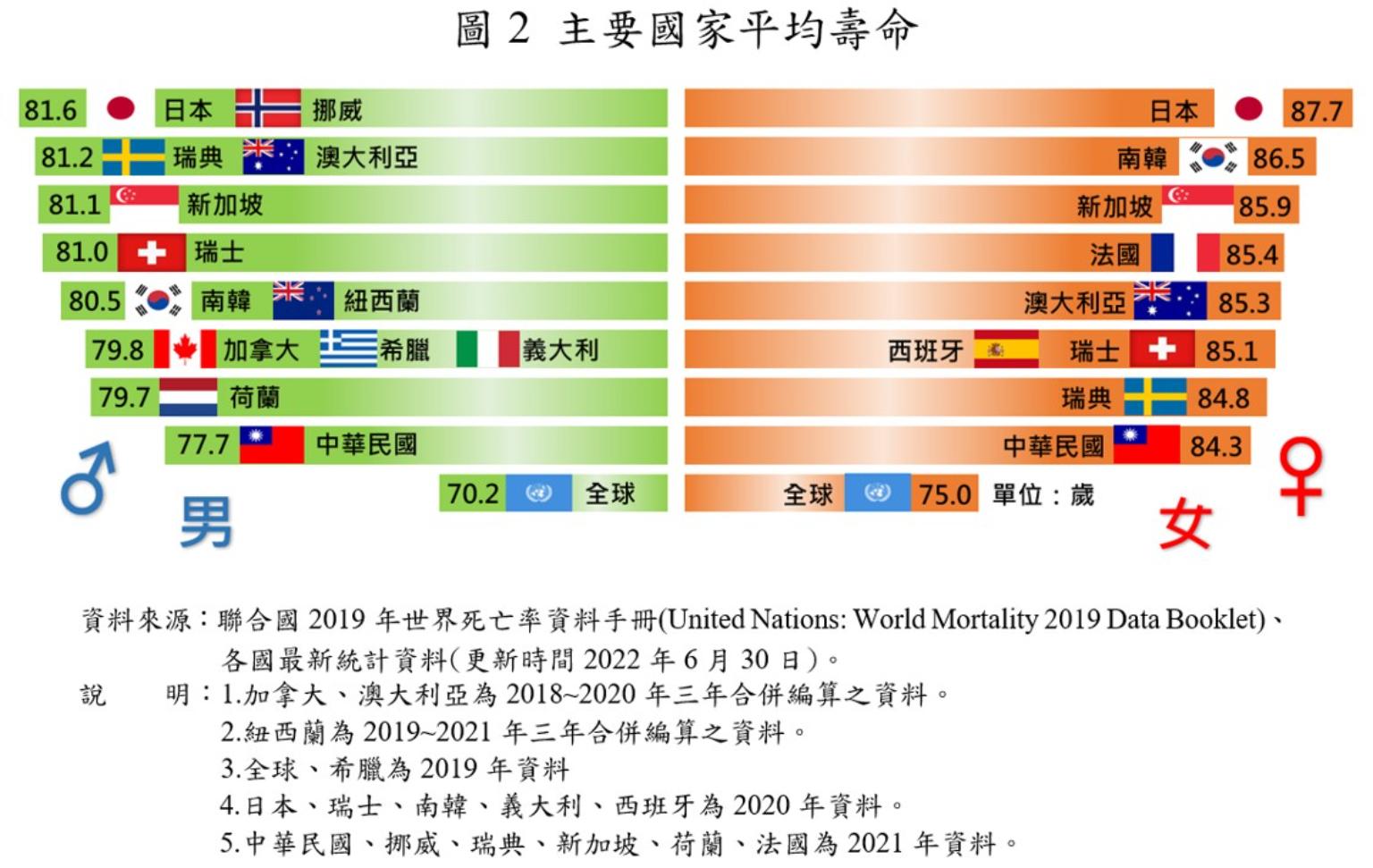 內政部今(19)日公布「110年簡易生命表」,國人的平均壽命為80.86歲,其中男性77.67歲、女性84.25歲,與108年同為歷年次高;另外與聯合國公布2019年全球平均壽命比較,我國男、女性平均壽命分別高於全球平均水準7.5歲及9.3歲。