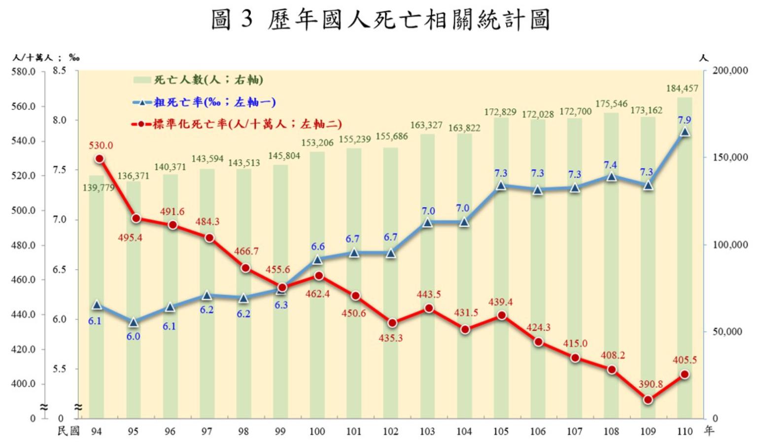 內政部指出,受人口老化影響,110年國人死亡人數為18萬4,457人,較109年增加1萬1,295人,其中65歲以上死亡人數13萬7,254人(占全國74.41%),較109年增加1萬427人;另外,110年粗死亡率為7.86‰,較109年增加0.52個千分點。