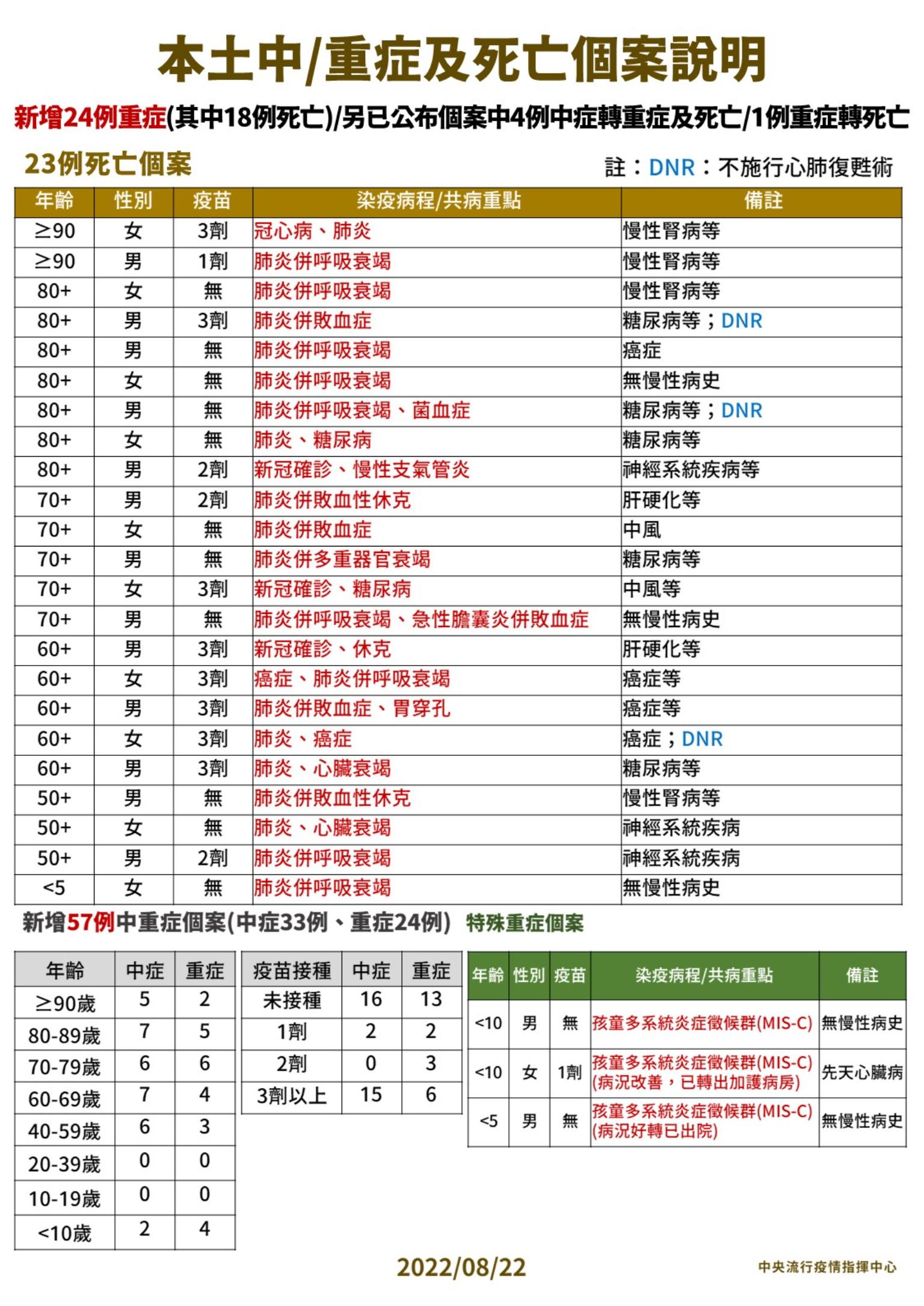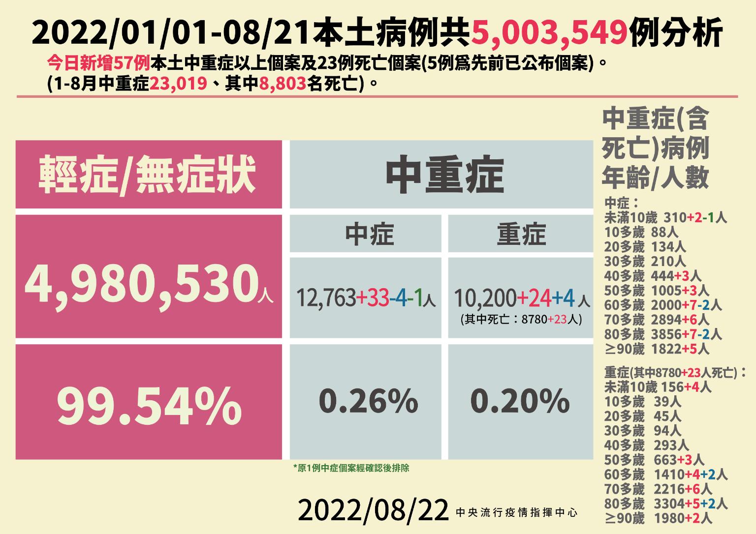 指揮中心指出,今日新增23例本土病例死亡個案,為13例男性、10例女性,年齡介於未滿5歲至90多歲以上,皆屬重度感染、20例具慢性病史、15例未接種3劑COVID-19疫苗。確診日介於今(2022)年5月19日至8月19日,死亡日期介於5月19日至8月19日,詳如新聞稿附件。