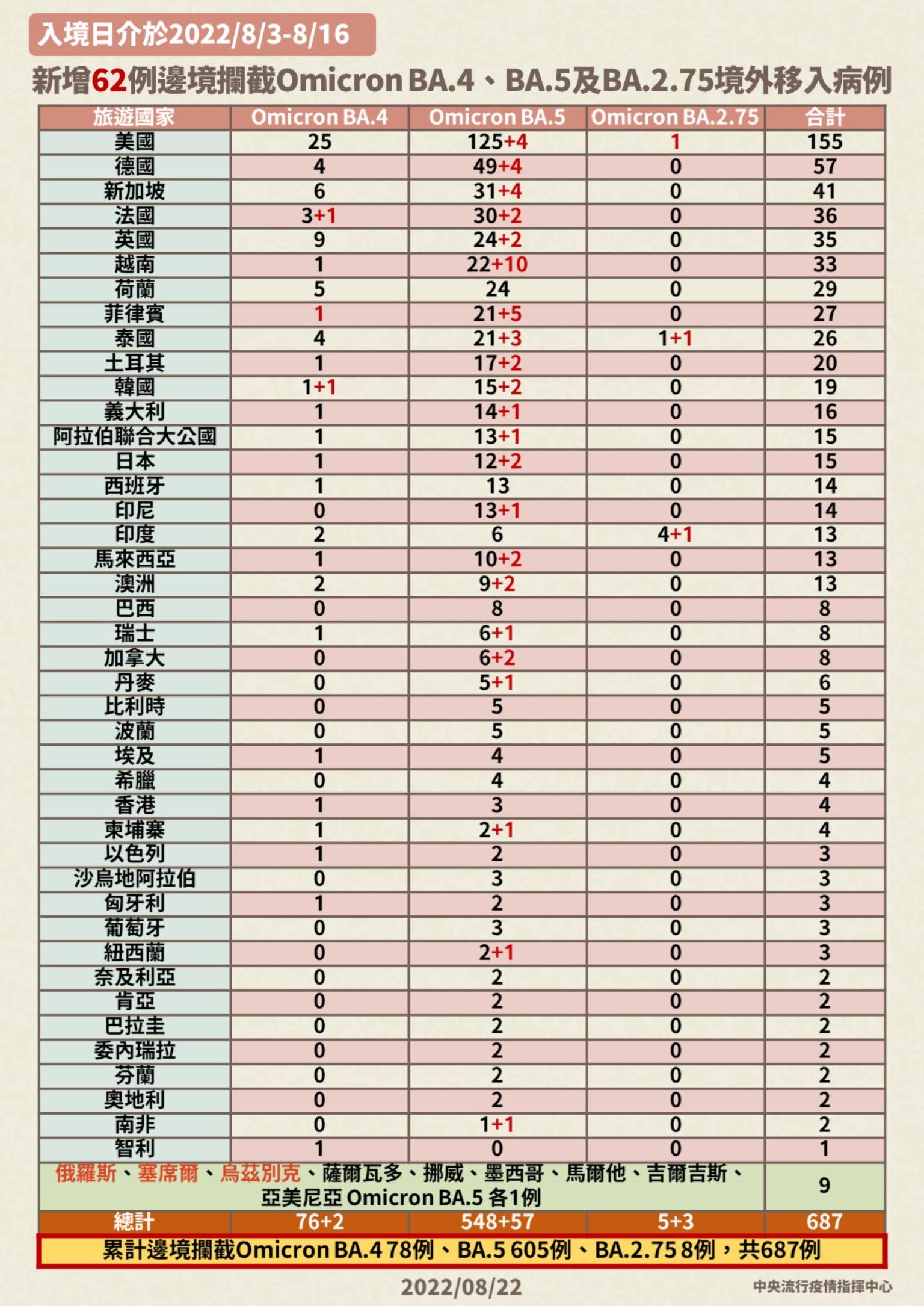 指揮中心表示,國內境外移入個案中新增檢出2株BA.4、57株BA.5、3株BA.2.75,個案分別為33例男性、29例女性,年齡介於未滿5歲至70多歲,入境日介於今年8月3日至8月16日。其中檢出BA.4個案分別自韓國及法國(各1例);BA.5個案分別自越南(10例)、菲律賓(5例)、德國、美國及新加坡(各4例)、泰國(3例)、日本、馬來西亞、英國、澳大利亞、法國、加拿大、韓國及土耳其(各2例)、俄羅斯、印尼、義大利、丹麥、塞席爾、紐西蘭、南非、柬埔寨、阿拉伯聯合大公國、瑞士及烏茲別克(各1例);BA.2.75個案分別自印度、泰國、美國(各1例)移入。
