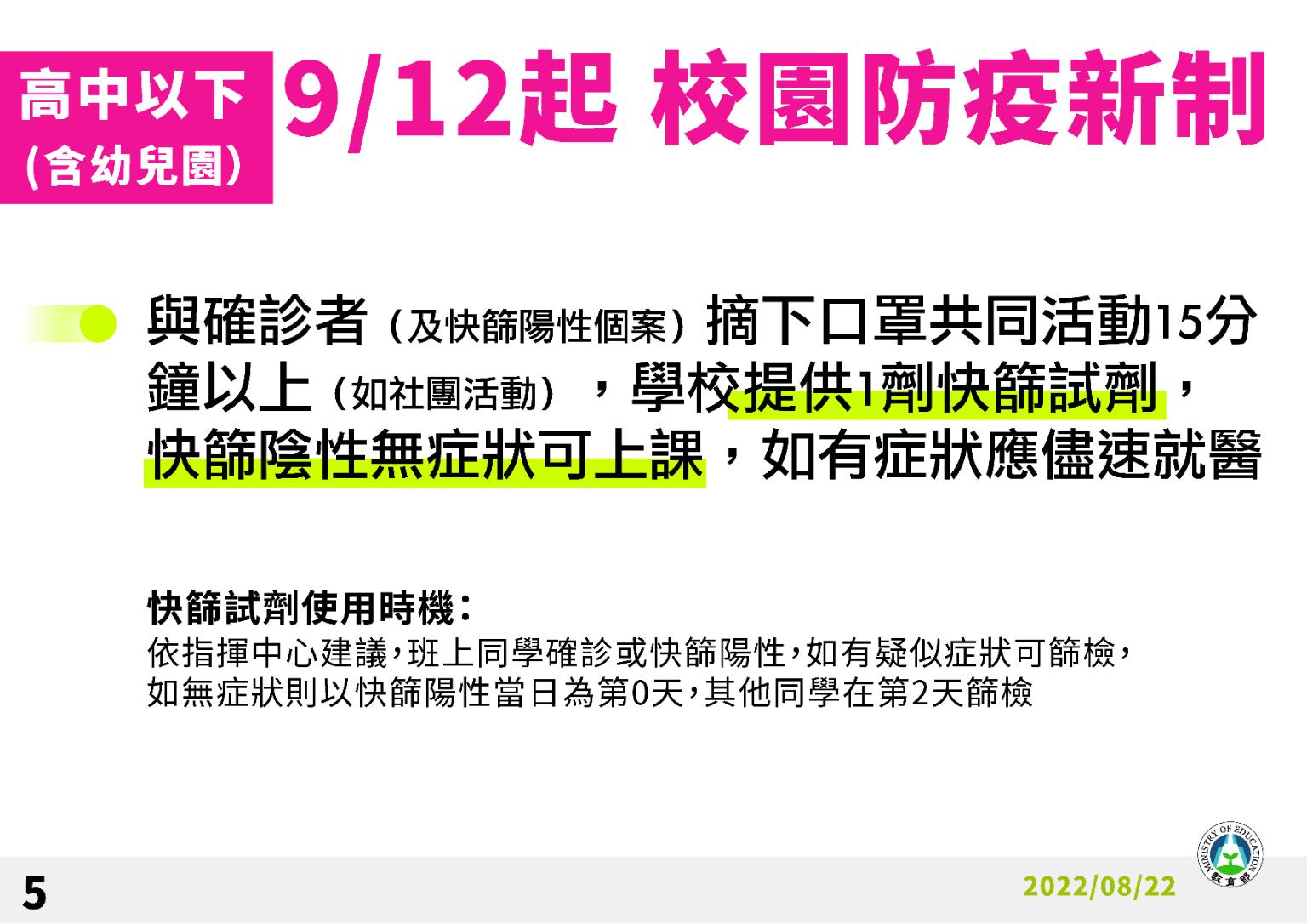壹、有關高中以下含幼兒園,自111年9月12日起實施校園防疫新制