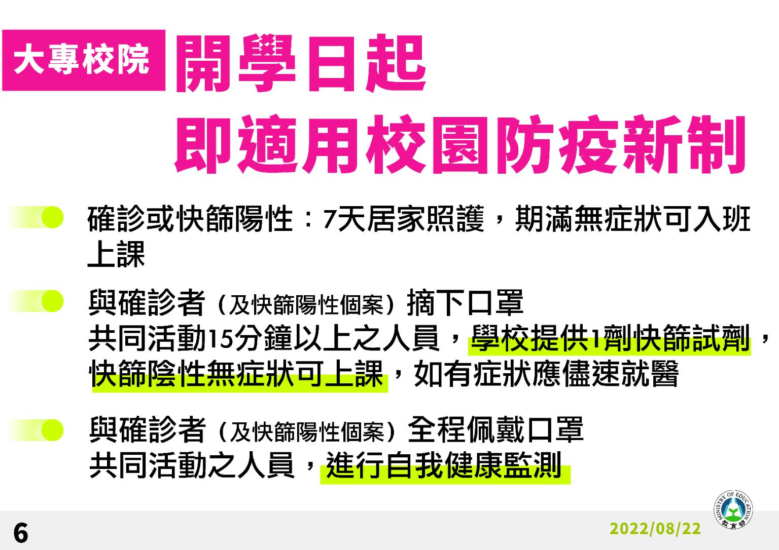 教育部表示,經與中央流行指揮中心就開學相關防疫規定進行討論研處,於兼顧疫情、學生受教權益與家長照顧負擔,實施校園防疫新制,說明如下: