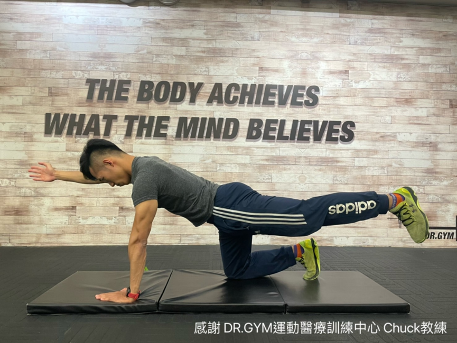 如果覺得做正常版的鳥狗式太難,我們可以選擇在起始動作之後,不要同時啟動手跟腳,可以選擇只動手或是只動腳。