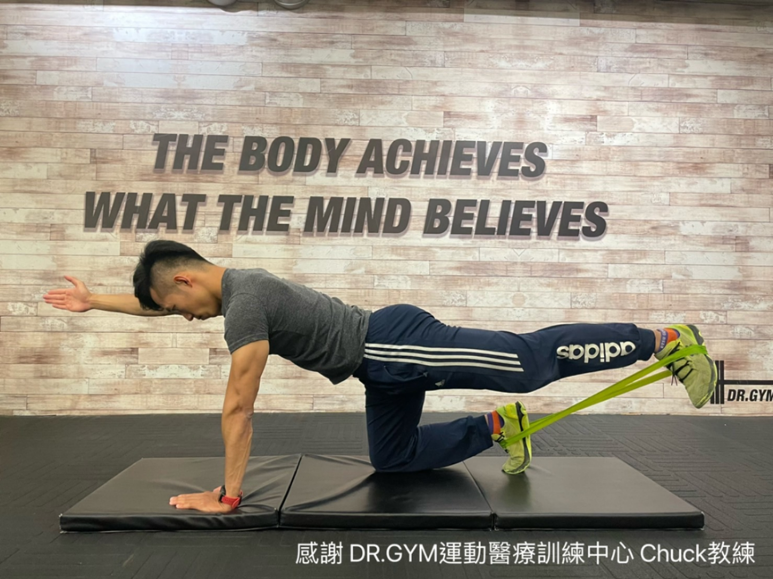 如果正常版的鳥狗式已經做得相當好了,也可以嘗試進階版,前腳掌套上彈力環,重複動作,並且保持骨盆不轉動,上背部不偏移。(圖3)