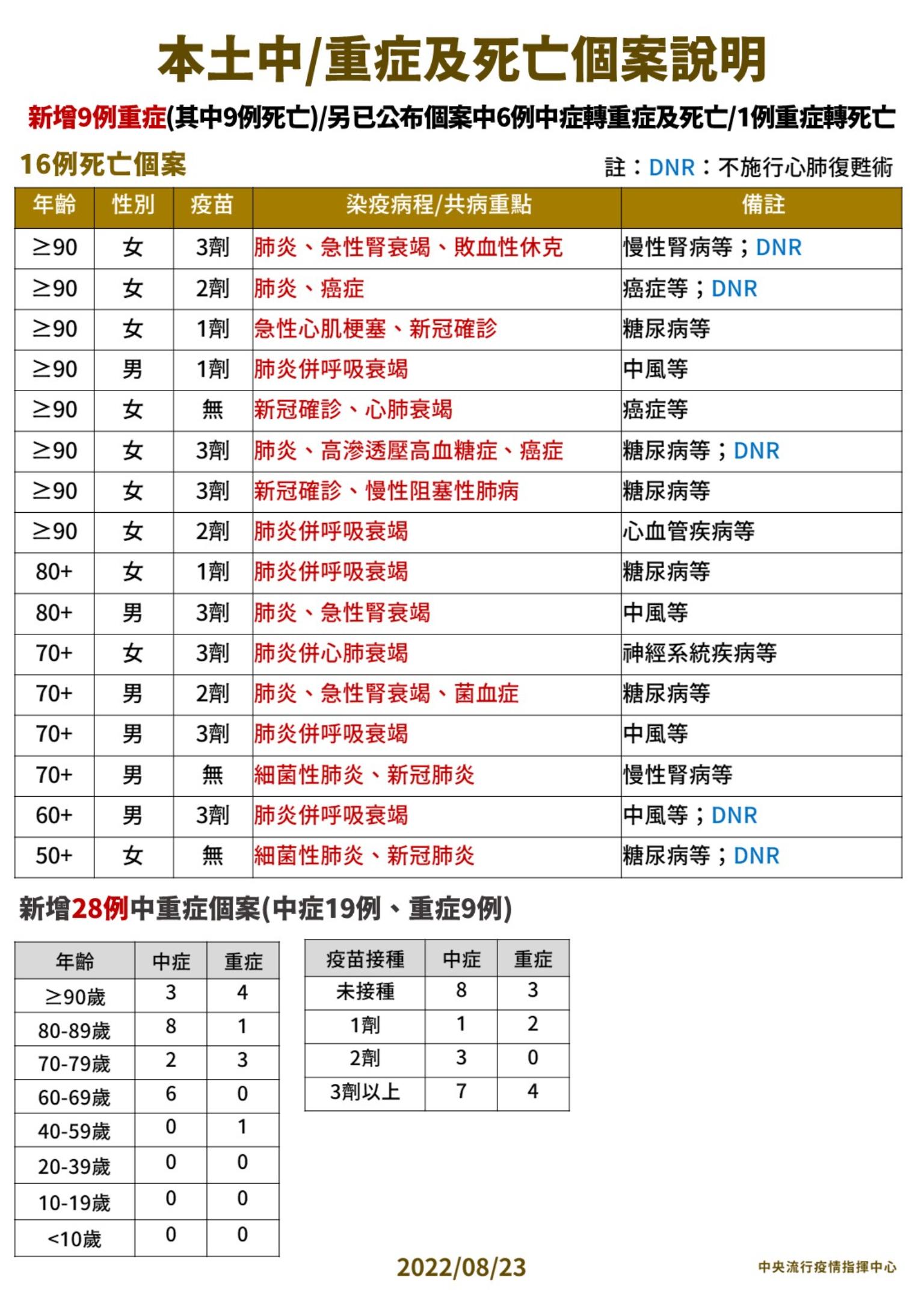 指揮中心指出,今日新增16例本土病例死亡個案,為6例男性、10例女性,年齡介於50多歲至90多歲以上,皆屬重度感染且具慢性病史、9例未接種3劑COVID-19疫苗。確診日介於今(2022)年6月24日至8月17日,死亡日期介於7月23日至8月20日。