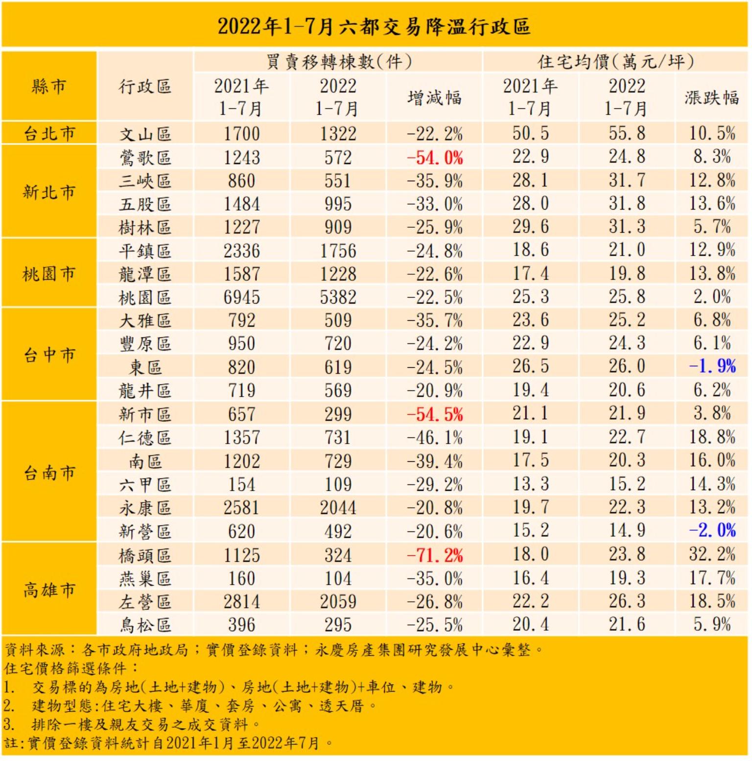 房市正在降溫中,房仲業者根據六都各地政局建物買賣移轉棟數資料,觀察今年1至7月六都房市交易表現,整體交易量合計為149,982棟,較去年同期152,051棟,衰退1.4%。