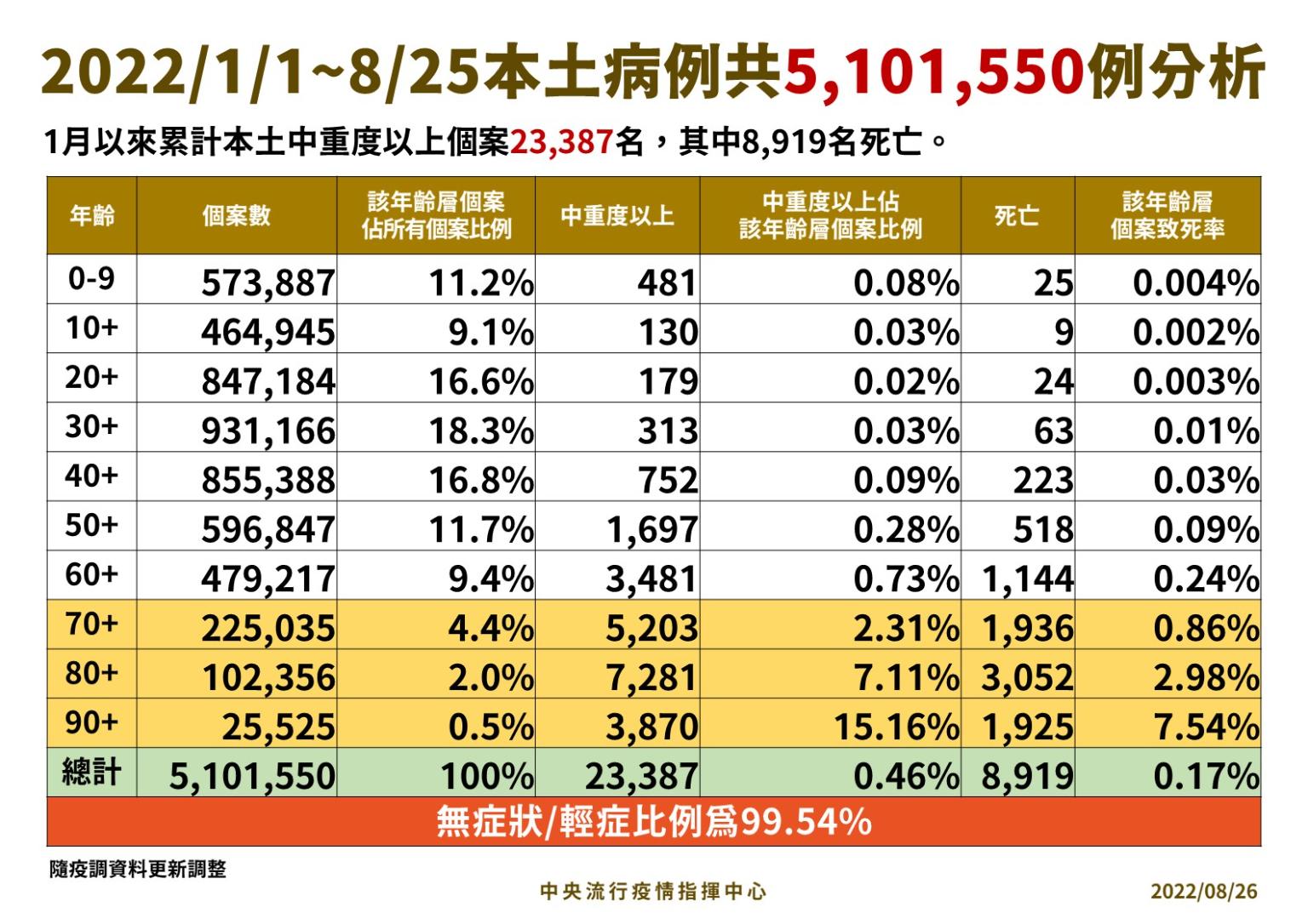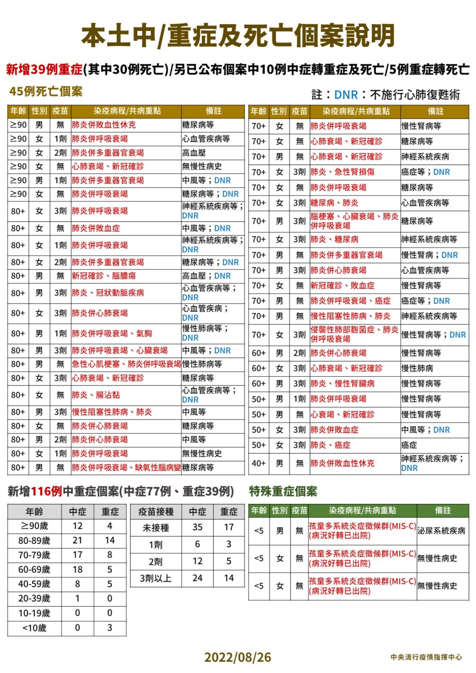 指揮中心指出,今日新增45例本土病例死亡個案,為21例男性、24例女性,年齡介於40多歲至90多歲以上,皆屬重度感染、43例具慢性病史、29例未接種3劑COVID-19疫苗。確診日介於今(2022)年6月15日至8月24日,死亡日期介於5月18日至8月23日,詳如新聞稿附件。