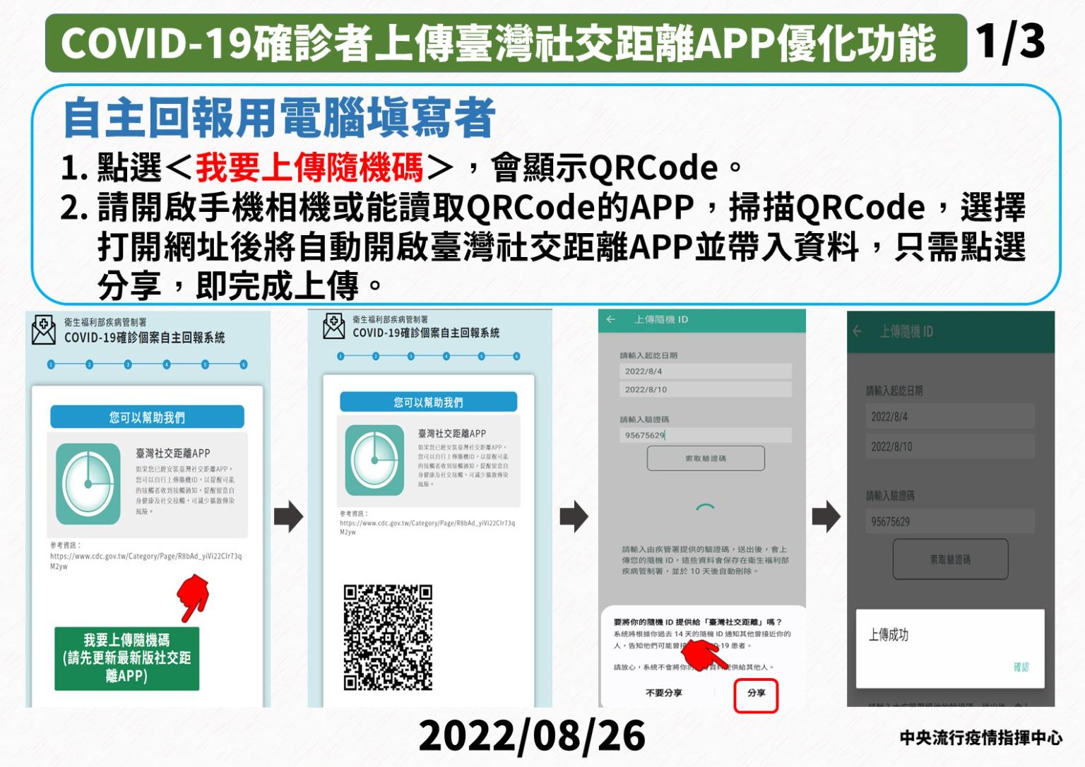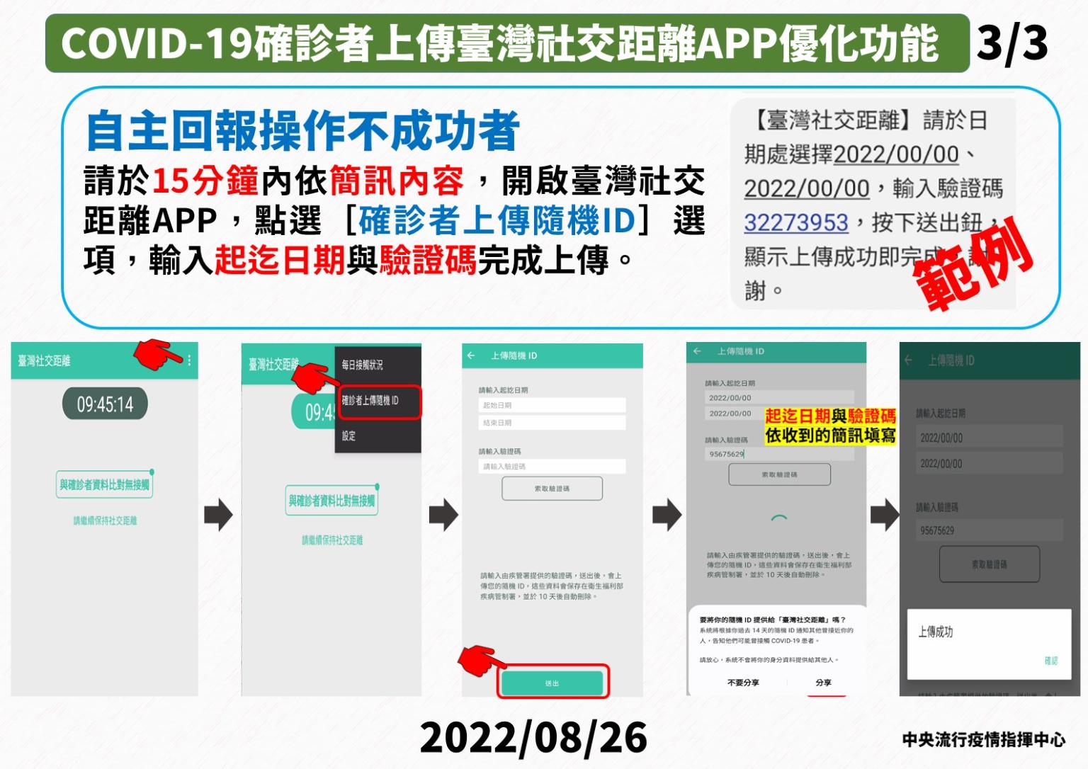指揮中心說明,民眾如有確診使用「臺灣社交距離APP」,原先僅能點選APP上[確診者上傳隨機ID]「索取驗證碼」等步驟,並於取得驗證碼簡訊的15分鐘內完成上傳操作。新版功能增加配合BBS系統的自動化步驟:
