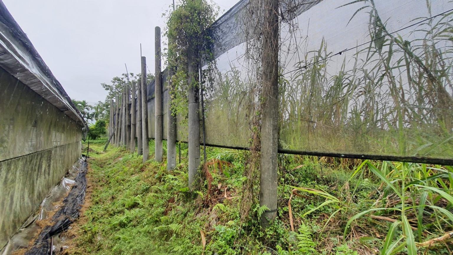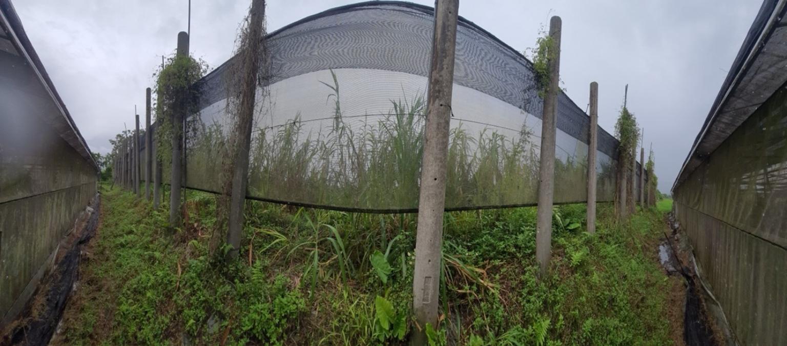 9月13日燦樹颱風過後,我再度訪問江玉寶,他在前天最後決定不收頂棚,只是把頂棚的邊緣解開,風大只會掀走頂棚,主結構還是可以保住,賭一把看看,反正頂棚的布、網已經用了很多年,也夠本了,如果拆下來再裝回去,拆得快裝得慢,也可能在拆裝時破壞了頂棚,所以就不收了。這次江玉寶和老天爺對賭,贏了!
