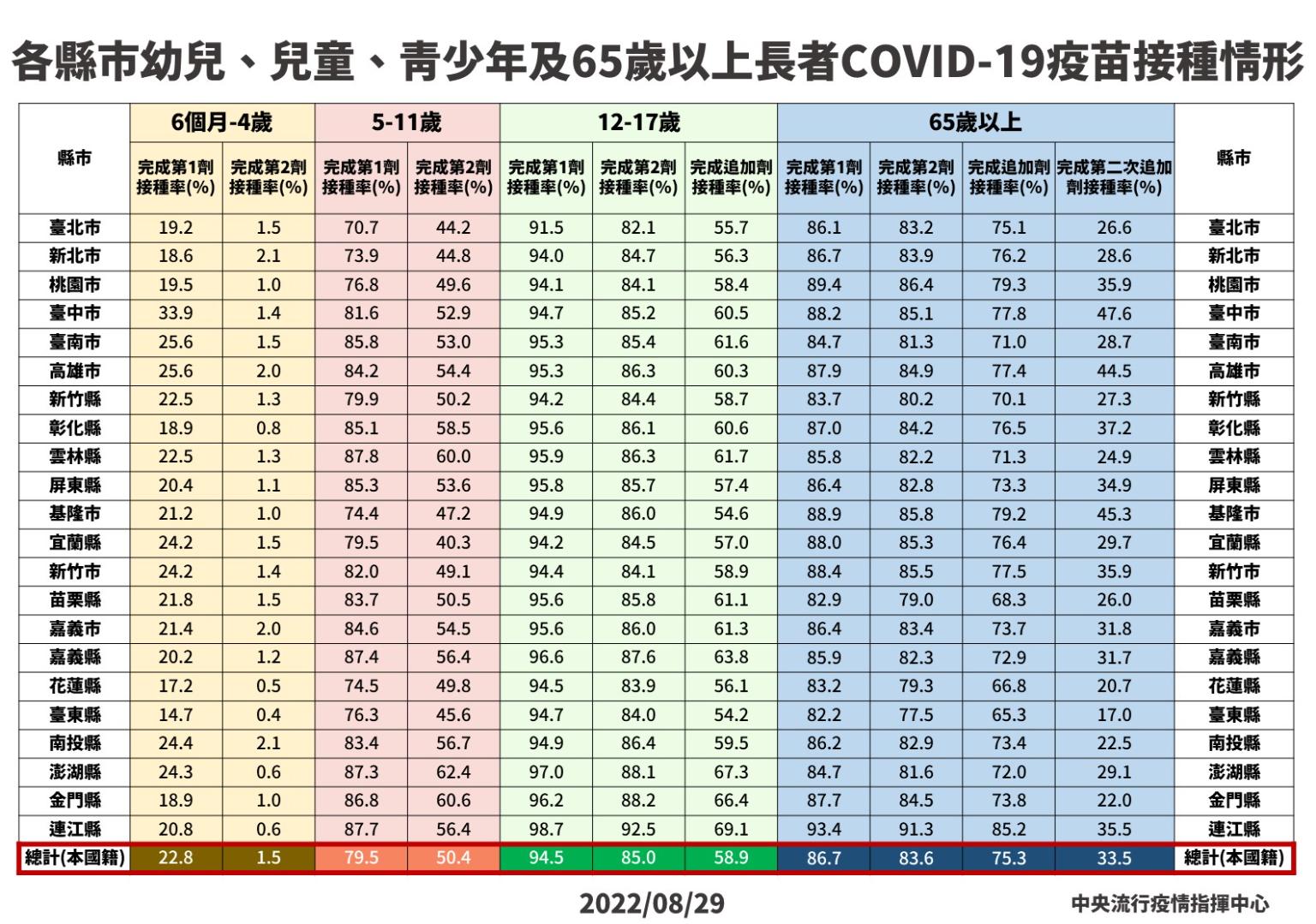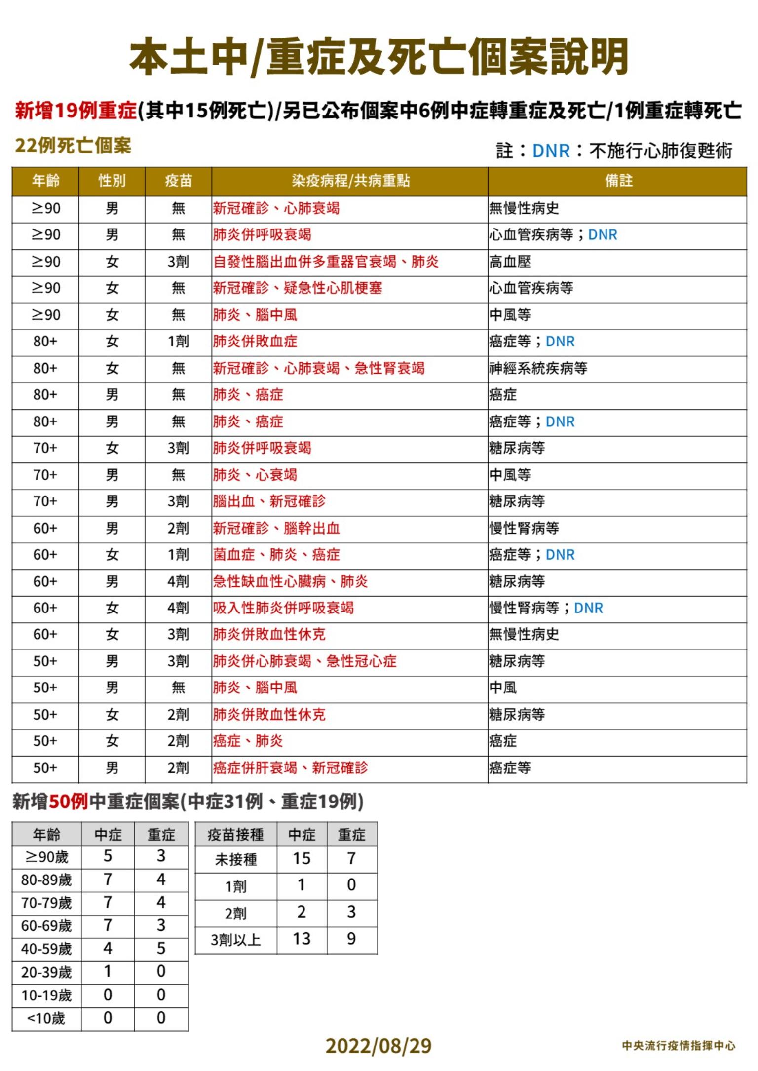 指揮中心指出,今日新增22例本土病例死亡個案,為11例男性、11例女性,年齡介於50多歲至90多歲以上,皆屬重度感染、20例具慢性病史、15例未接種3劑COVID-19疫苗。確診日介於今(2022)年7月3日至8月26日,死亡日期介於8月11日至8月26日,詳如新聞稿附件。