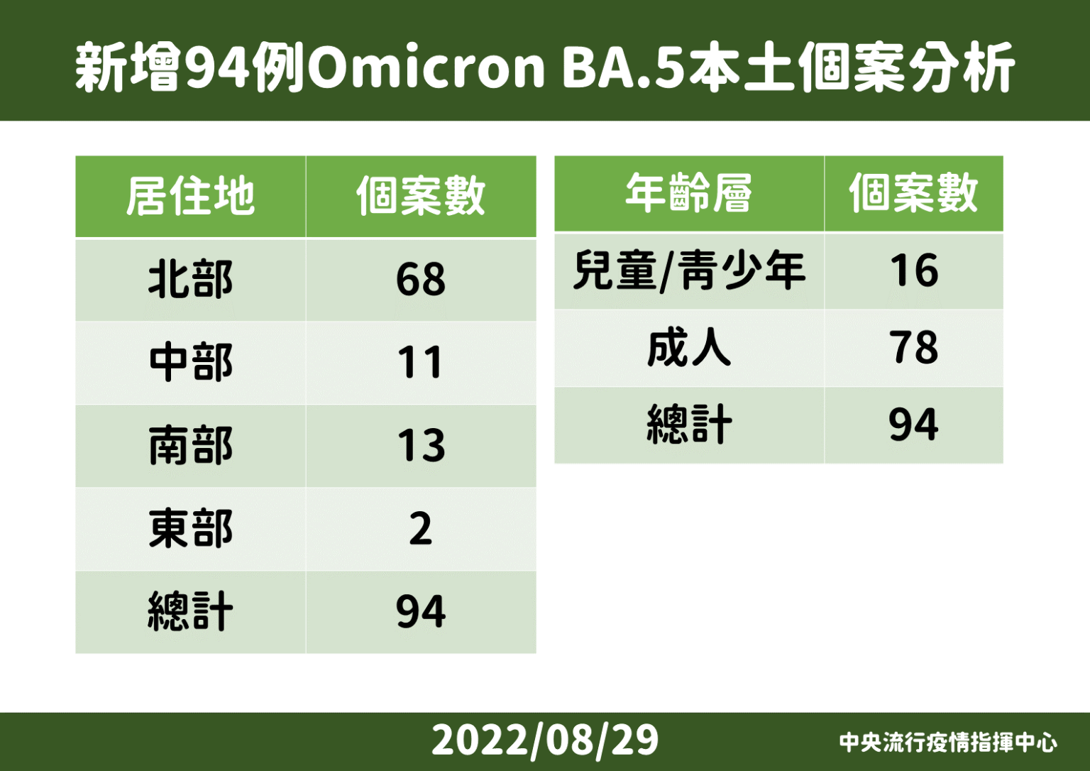 指揮中心指出,今日新增94例Omicron亞型變異株BA.5本土個案,占上週所有已定序之234例的40.2%,為39名男性、55名女性,年齡介於未滿5歲至80多歲,分布為北部68例、中部11例、南部13例、東部2例,確診日介於7月3日至8月24日。