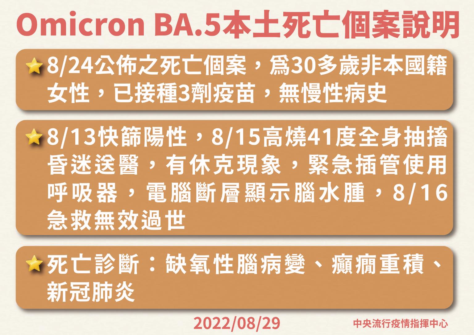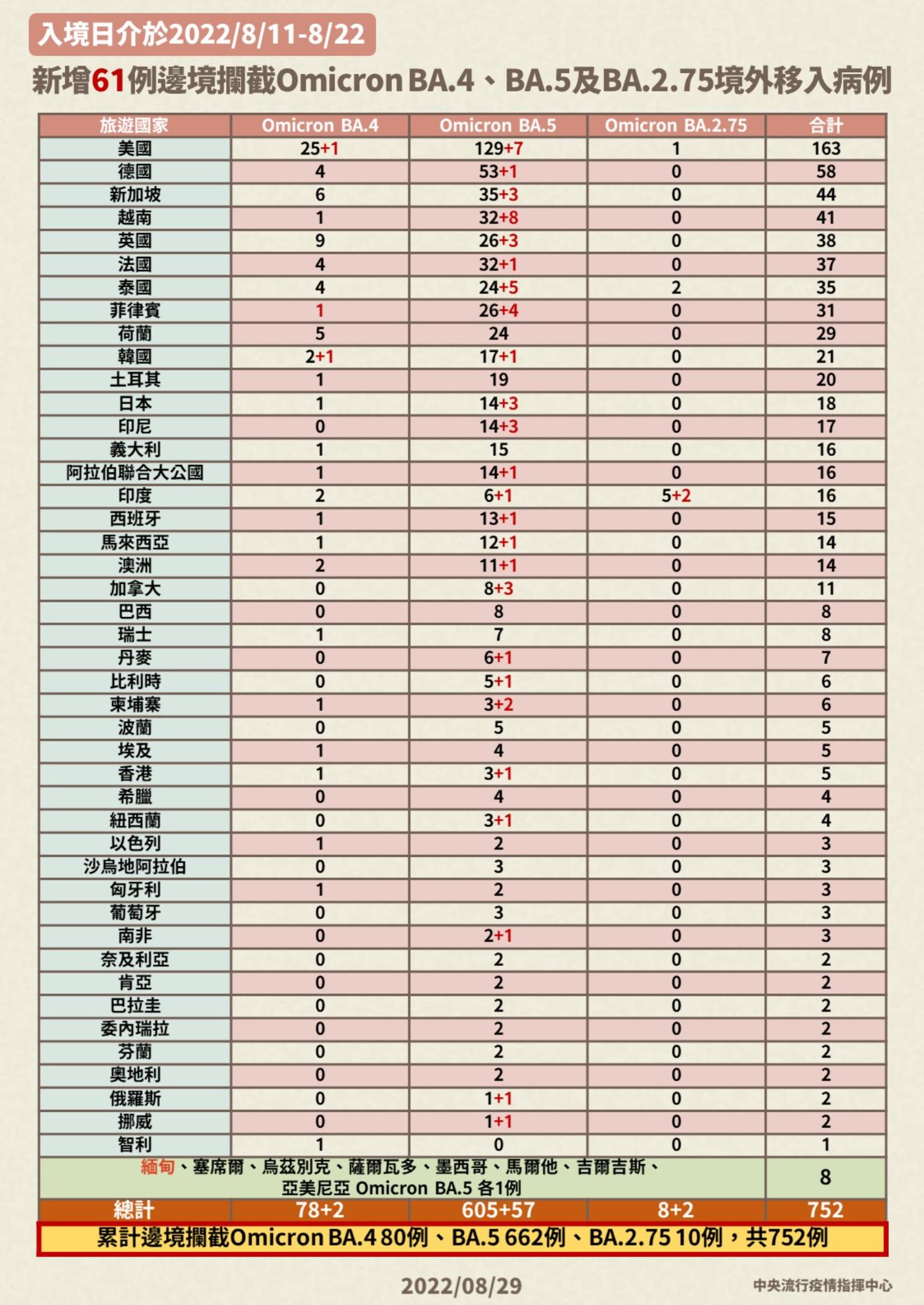 指揮中心表示,國內境外移入個案中新增檢出2株BA.4、57株BA.5、2株BA.2.75,個案分別為36例男性、25例女性,年齡介於未滿5歲至60多歲,入境日介於今(2022)年8月11日至8月22日。其中檢出BA.4個案分別自韓國及美國(各1例);BA.5個案分別自越南(8例),美國(7例),泰國(5例),菲律賓(4例),日本、印尼、新加坡、英國及加拿大(各3例),柬埔寨(2例),馬來西亞、法國、南非、紐西蘭、韓國、俄羅斯、德國、澳大利亞、阿拉伯聯合大公國、比利時、挪威、香港、西班牙、緬甸、丹麥及印度(各1例);BA.2.75個案均自印度移入。