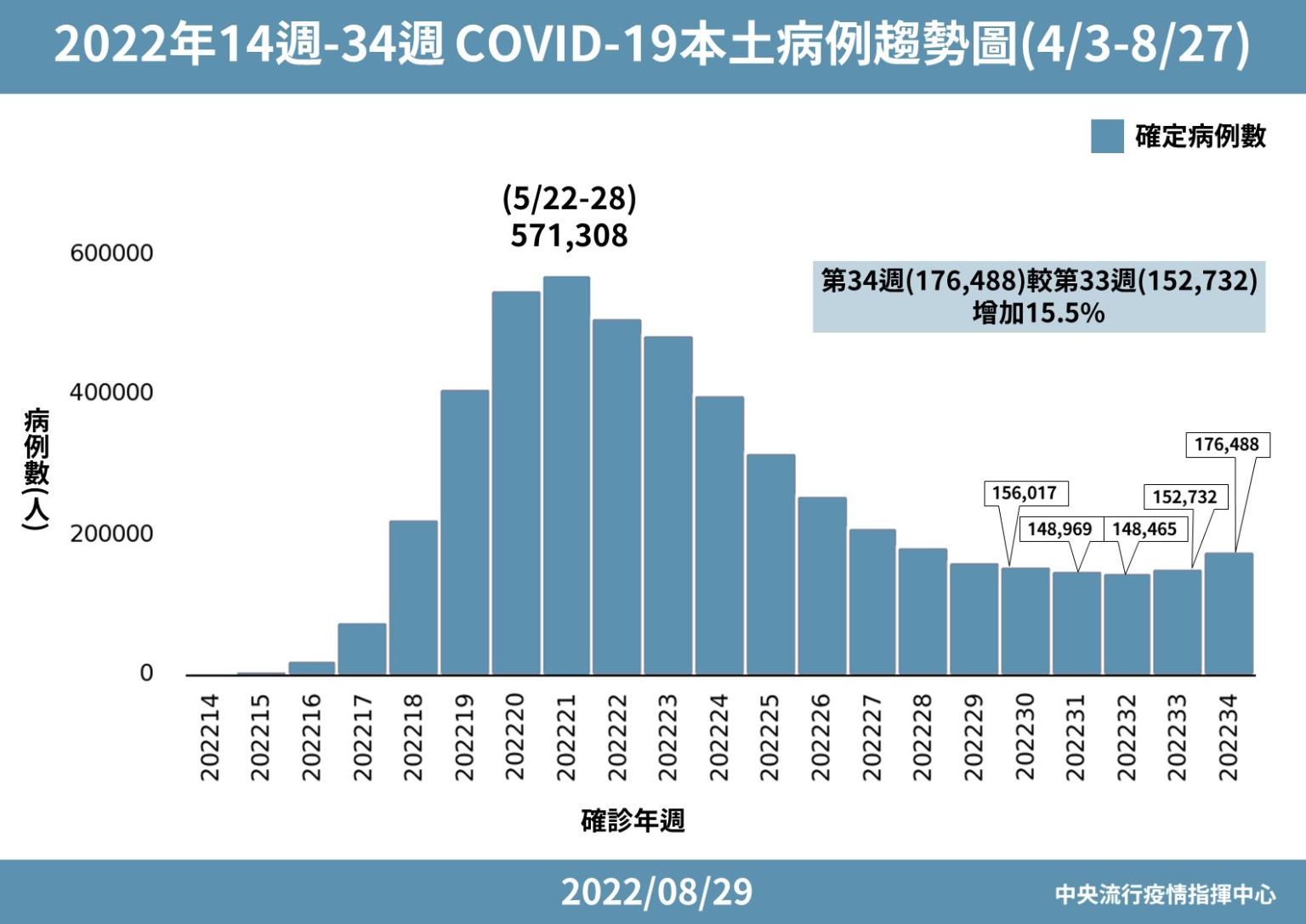 指揮官王必勝表示,上上週是本土確診數連續11周下降後首度上升,上週不但上升而且幅度已經開始增加,增加15.5%,幾乎可以確定BA.5疫情已經開始,呼籲民眾遵守防疫措施。