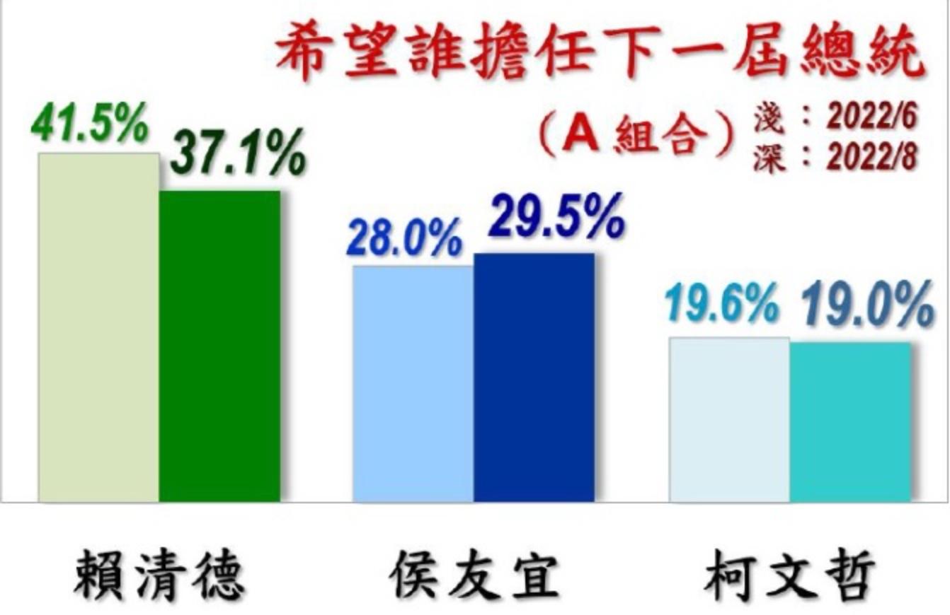 美麗島電子報於今日公布8月國政民調,針對2024年總統大選的對戰組合,如果為民進黨賴清德、民眾黨柯文哲、國民黨侯友宜PK,支持度分別為37.1%(與6月相比-4.4%)、29.5%(+1.5%)、19%(-0.6%),僅賴清德的支持度變動較為明顯而且可能多轉向觀望。