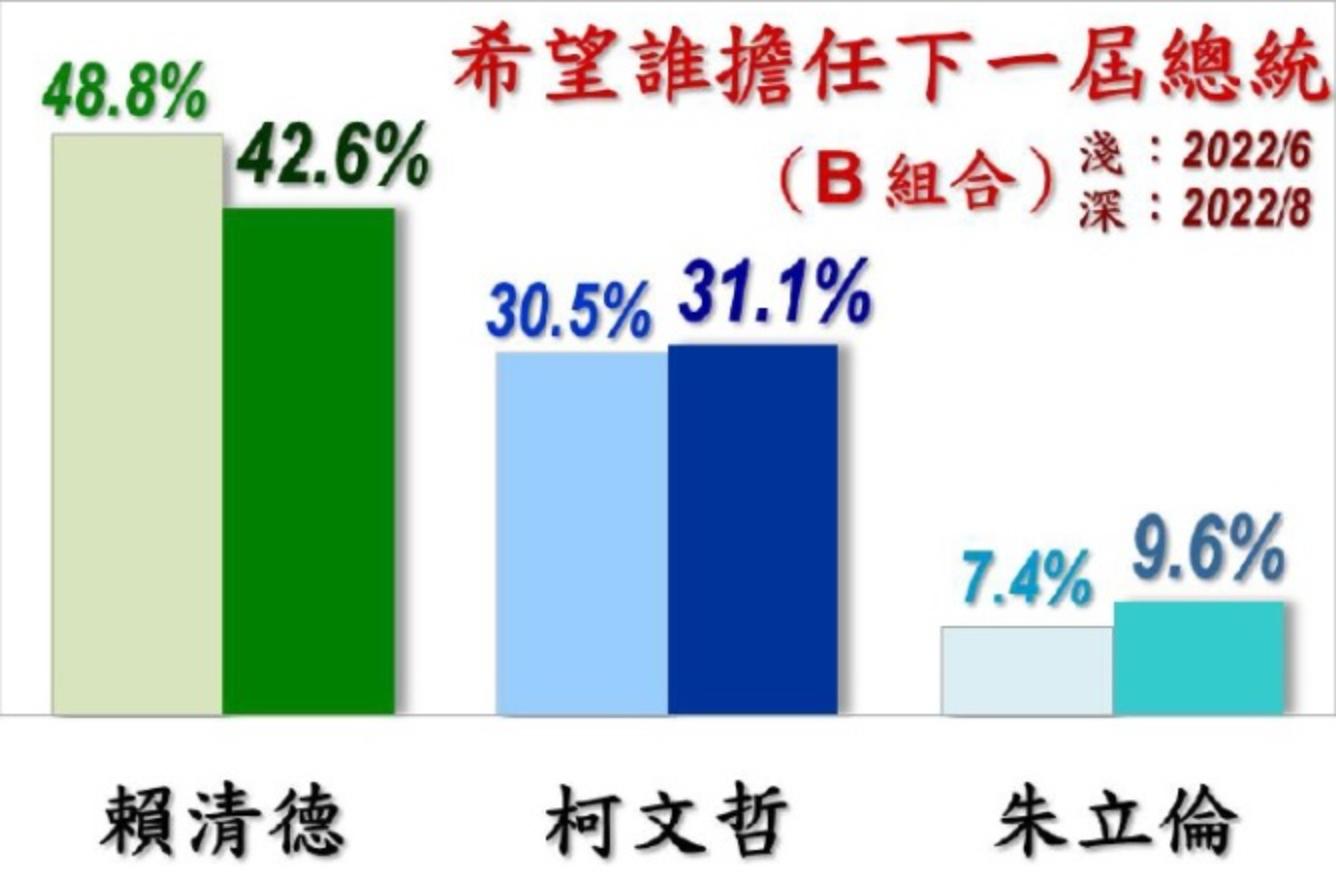 如果對戰組合改成民進黨賴清德、民眾黨柯文哲、國民黨朱立倫,支持度則分別為42.6%(-6.2%)、31.1%(+0.6%)、9.6%(+2.2%)。賴清德的支持度最高,但與6月相比的減幅也更大,支持度變動較為明顯且可能多轉向觀望。