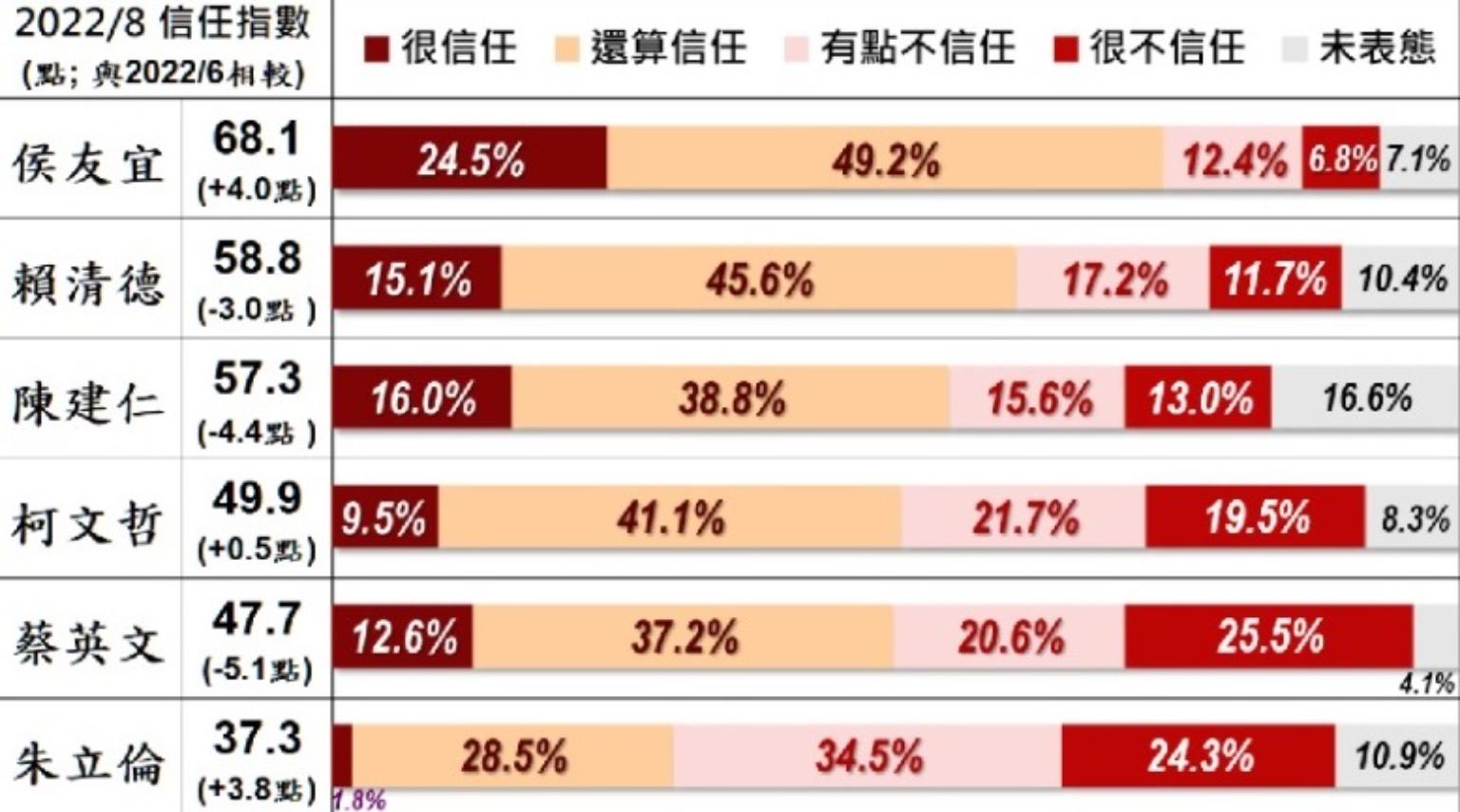 另在主要政治人物的「信任指數」調查中,排序第1名的是新北市長侯友宜,比6月增加4.0點達68.1點,顯示已自「恩恩事件」中回溫。