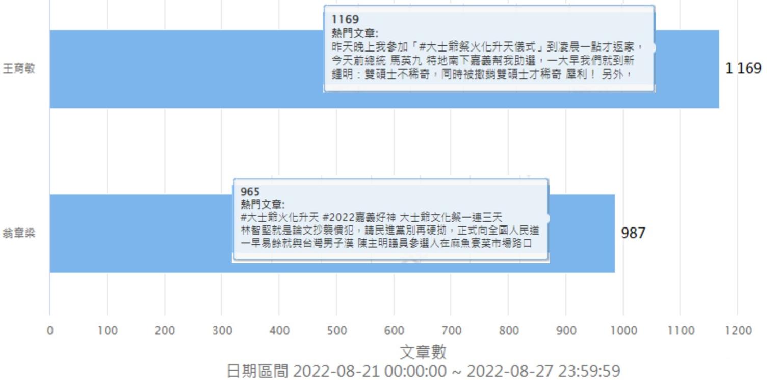 根據藍營內部網路大數據調查報告,王育敏助選團隊組成包含本土中性路線的既有團隊、親馬派、以及羅智強網路主戰派,彼此各司其職未見混亂;統計上週8月21至27日,王育敏文章數高達1169篇,翁章梁為965篇,總聲量王育敏略高於翁章梁。