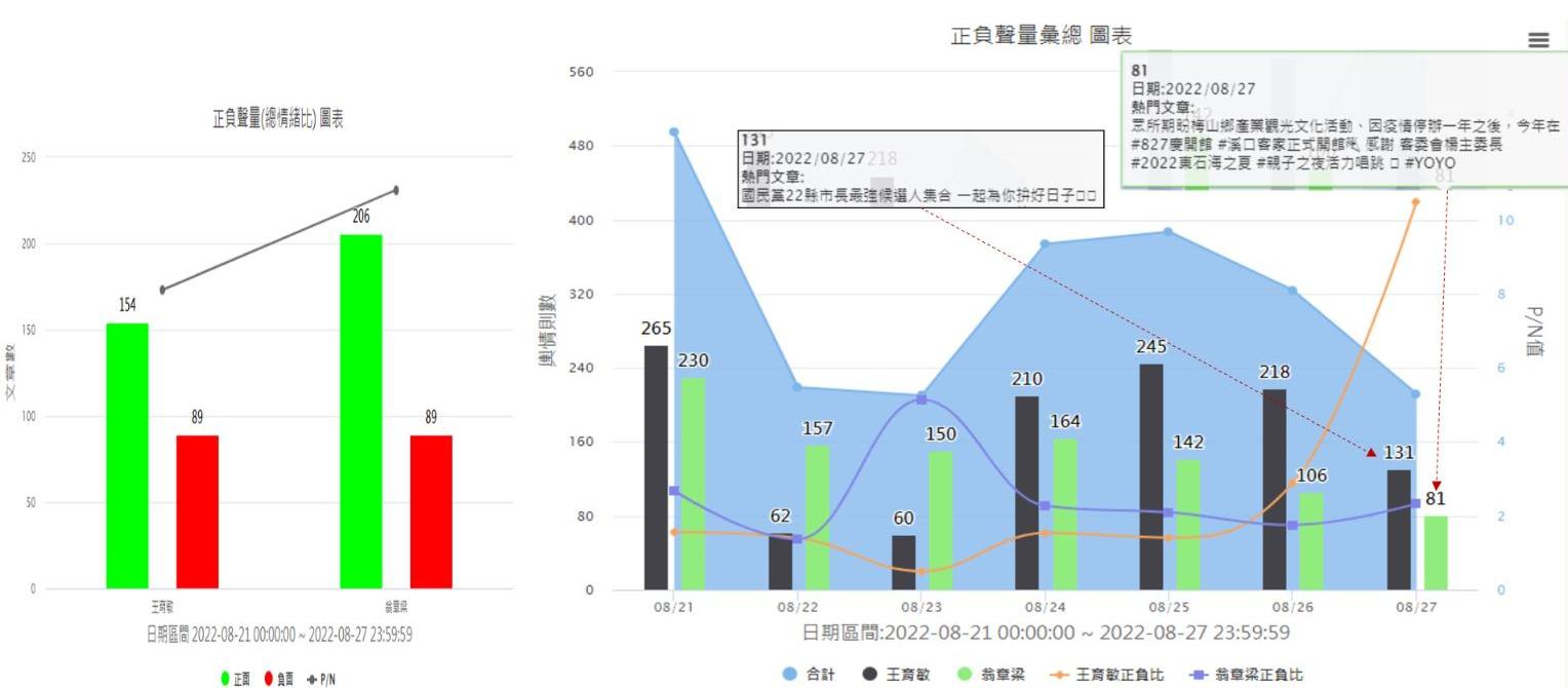 報告分析,8月24日起,王育敏連續4天,分別就藍營基本盤(馬英九助選)、攻擊性議題(雙碩士撤銷)、女性主視覺與中性議題(既有團隊結合鄭麗文等女性政治名人),每日輪番操作;而翁章梁多在縣政公務、縣內活動上進行露出,相對較無討論、轉發、擴散、媒體交叉露出之經營。