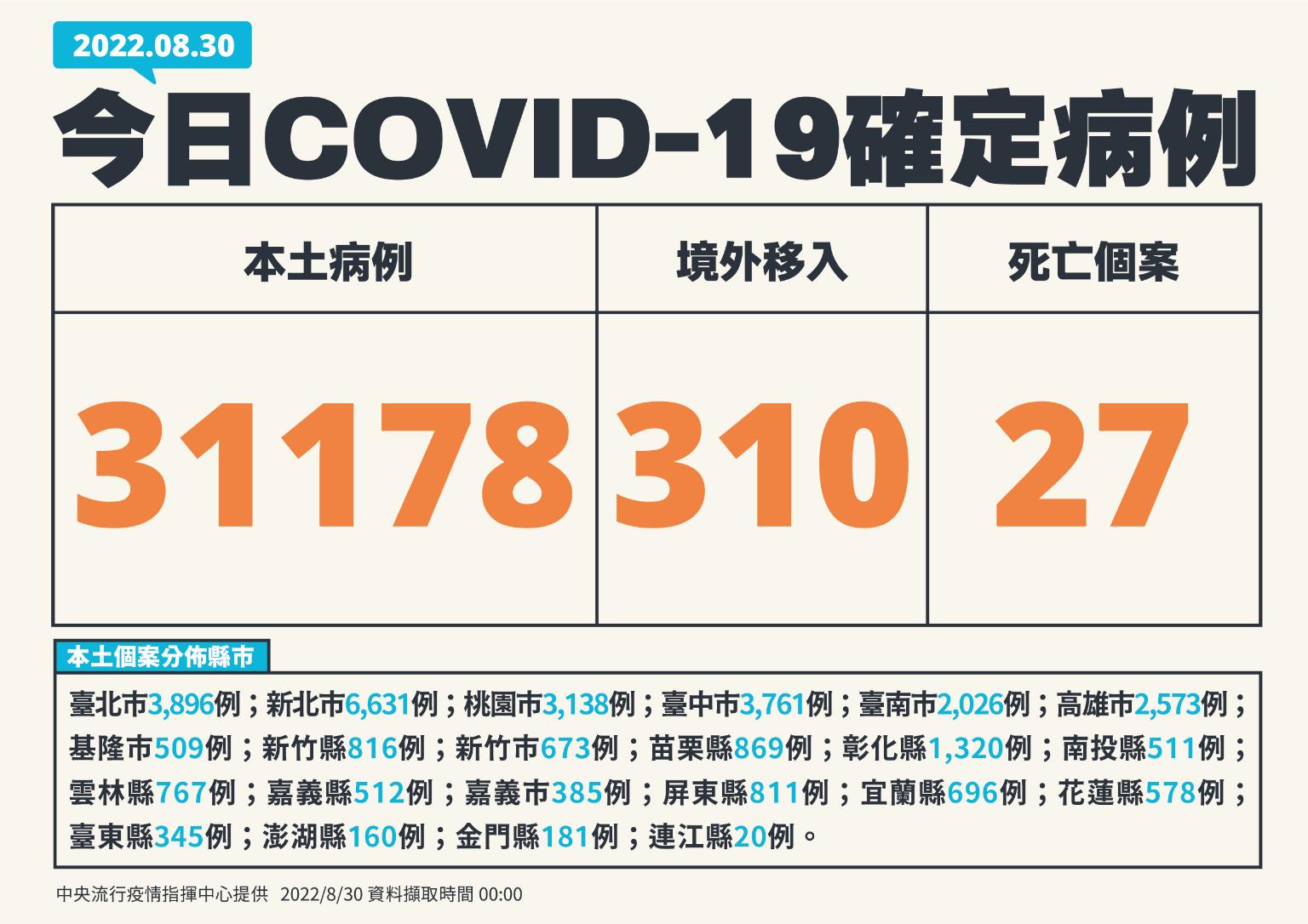 中央流行疫情指揮中心今(30)日公布國內新增31,488例COVID-19確定病例,分別為31,178例本土個案及310例境外移入;另確診個案中新增27例死亡。