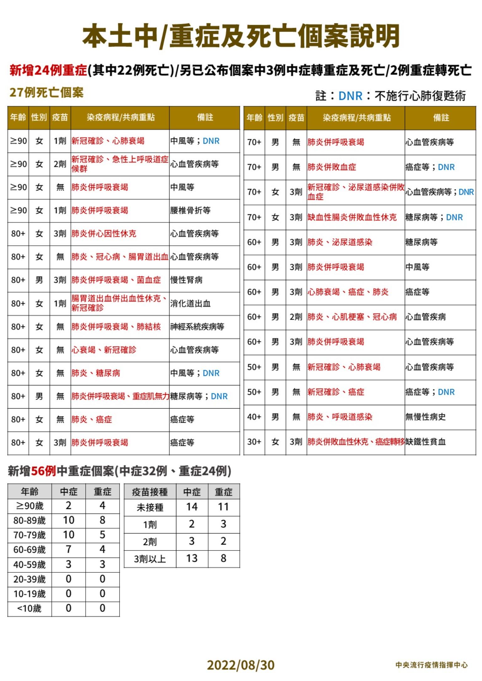 指揮中心指出,今日新增27例本土病例死亡個案,為12例男性、15例女性,年齡介於30多歲至90多歲以上,皆屬重度感染、26例具慢性病史、17例未接種3劑COVID-19疫苗。確診日介於今(2022)年5月30日至8月27日,死亡日期介於6月9日至8月27日。