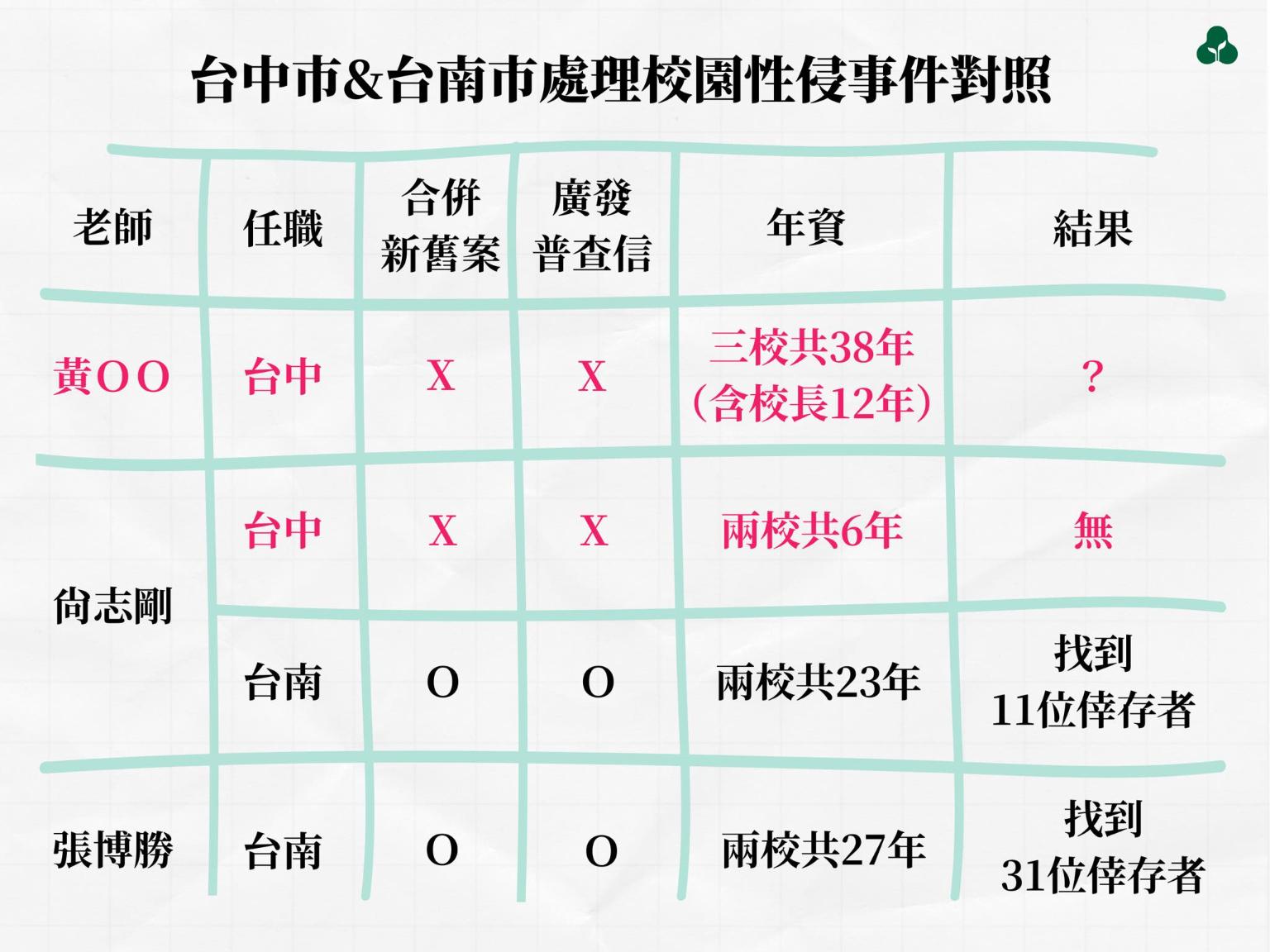 教育部國教署學安組組長黃瀞儀則再次強調,要求擴大清查並成立單一受理窗口,讓真相能更釐清,此外台中市府以市府層級併案調查,才能夠還原真相,不要把權責丟回給學校,畢竟加害人有權勢、地位上比較特殊的狀況。